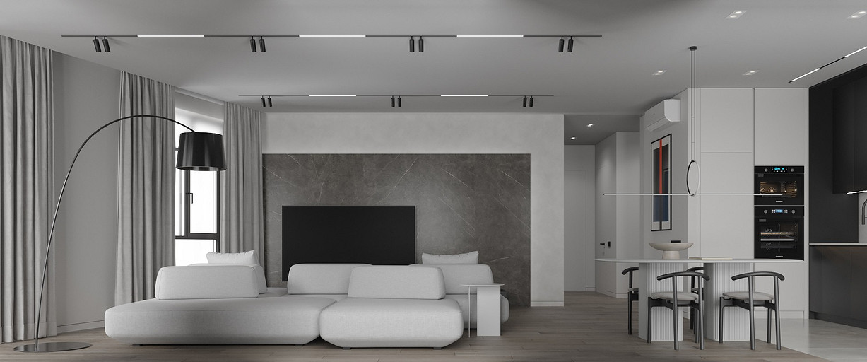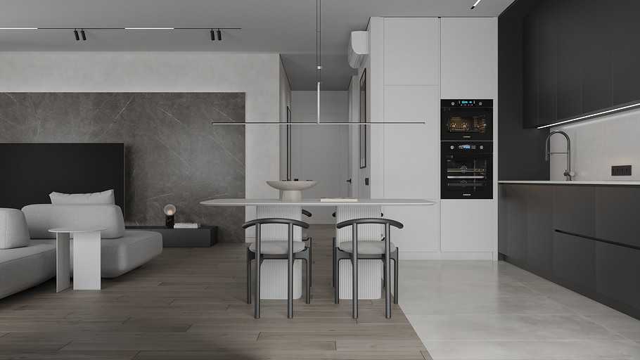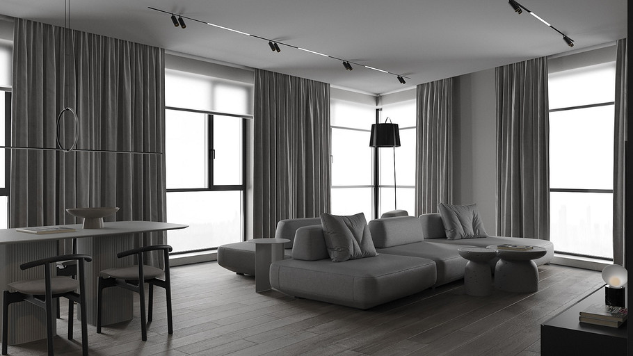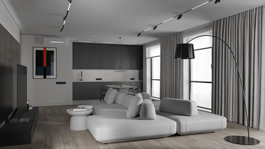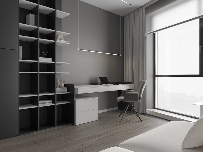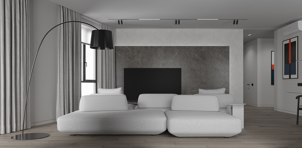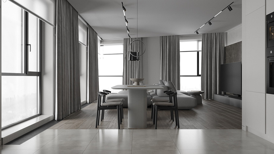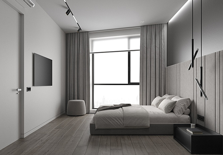 Современная квартира Wellton Towers. Квартира в современном стиле с элементами минимализма выполнена в серых тонах.