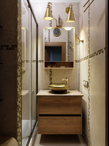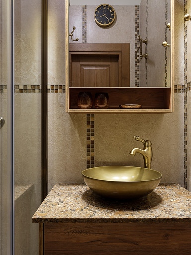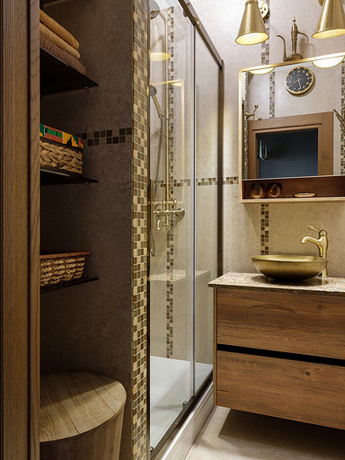 - Стены и пол: керамогранит Grespania, мозаика из натурального камня Caramelle Mosaic