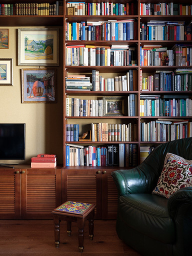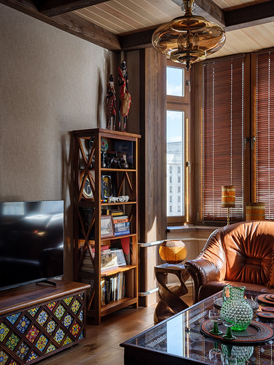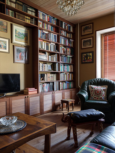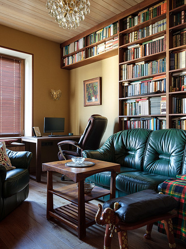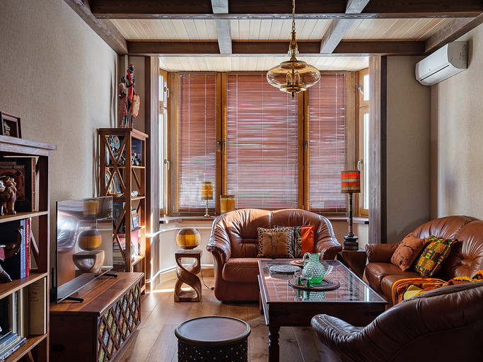 - Мебель: библиотека с реечными дверками из лиственницы Okanda, кресло и диван из кожи «Пинскдрев», стол и тумба из массива дуба Fabrika-Lofta, кофейные столики с керамическими изразцами — салон Artefacto