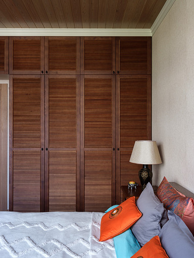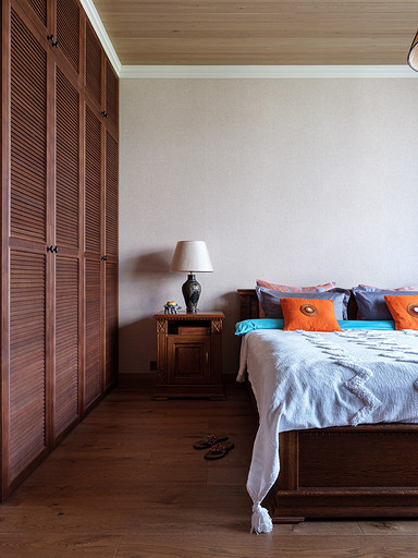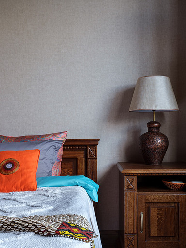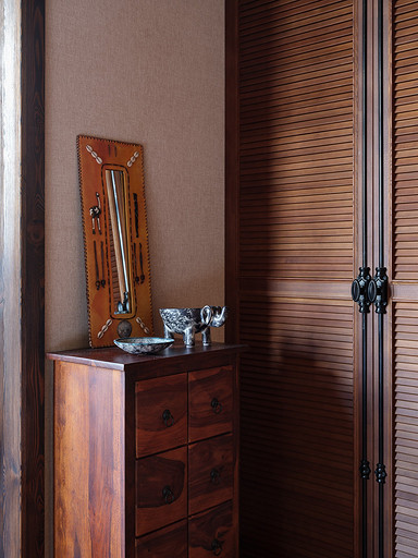 - Мебель: гардеробные реечные шкафы Okanda, кровать и прикроватные тумбы «Пинскдрев», сундук с керамической плиткой ручной работы и комод из палисандра произведены в Индии — «Галереи колониального интерьера»