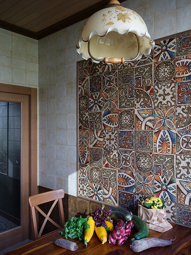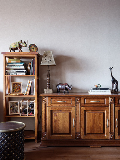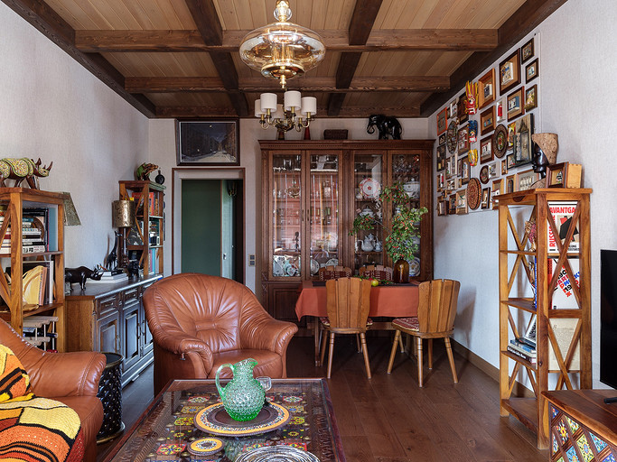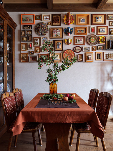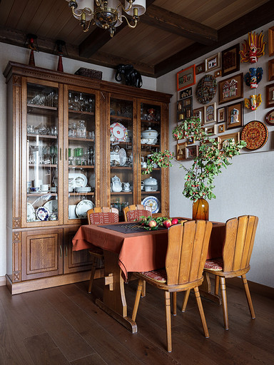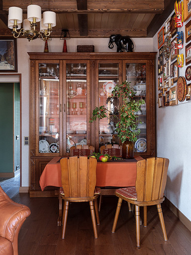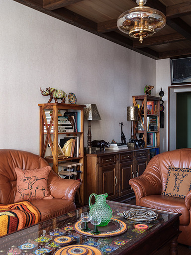 - Мебель: сервант для посуды, комод, кресло и диваны из кожи «Пинскдрев», стол и стулья — винтаж, собственность заказчиков, этажерки, сундук и стол с керамической плиткой ручной работы произведены в Индии — «Галереи колониального интерьера»