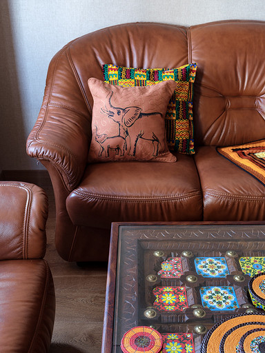 - Освещение: кенийские плафоны с резными узорами — собственность заказчиков