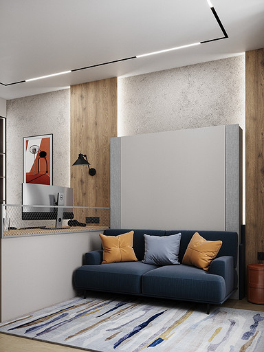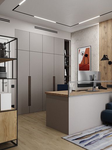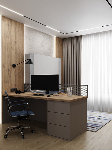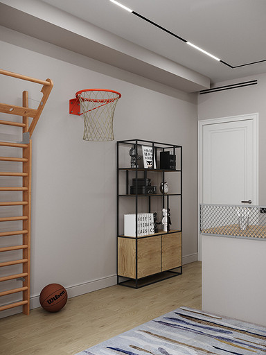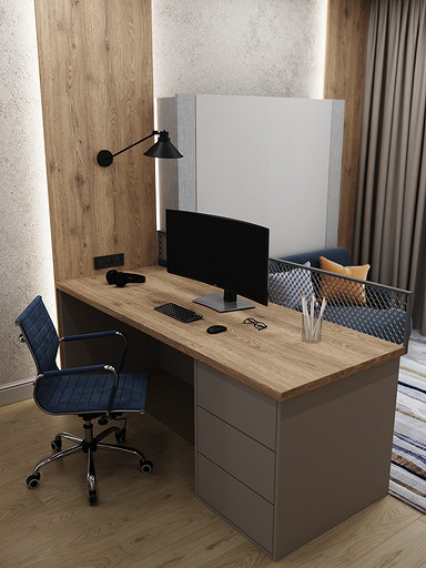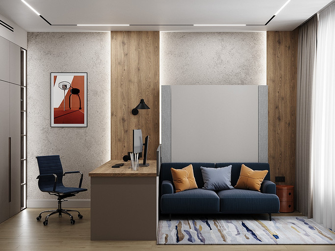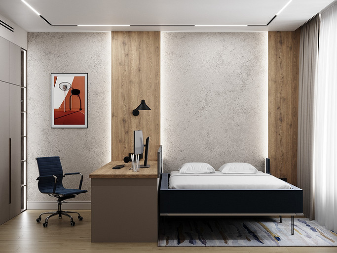 В данной комнате будет проживать подросток — активный, спортивный, общительный. Поэтому родители попросили вместо обычной кровати использовать кровать-трансформер — пришли гости, кровать быстро сложили — получился диванчик. Также предусмотрели большой стол с местом для большого монитора — мальчик увлекается программированием и компьютерными играми.
