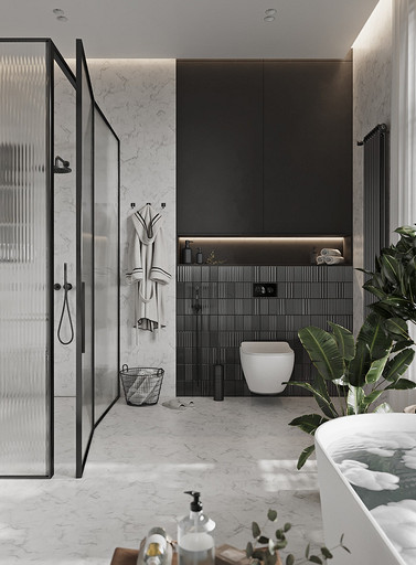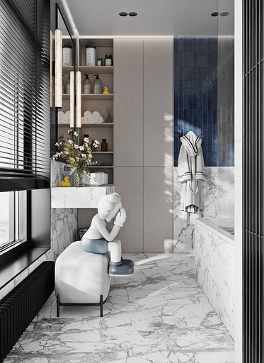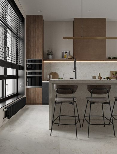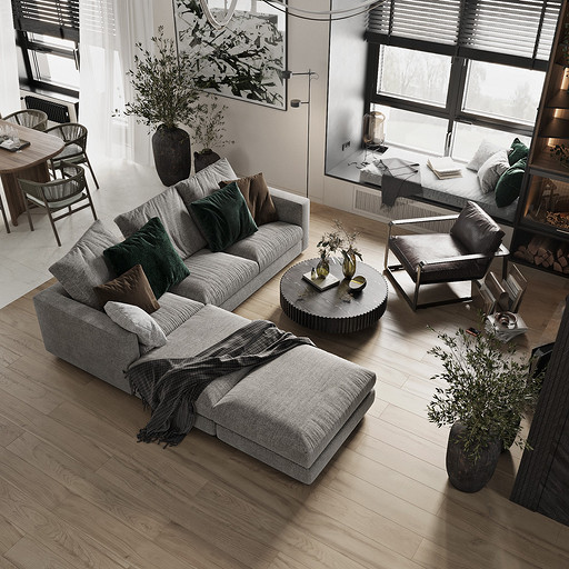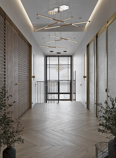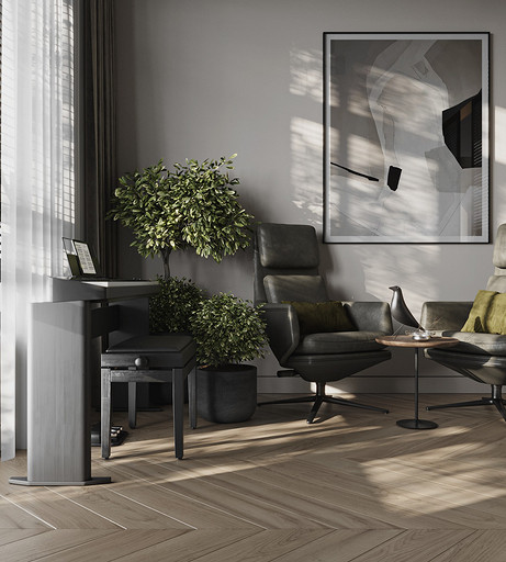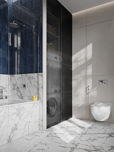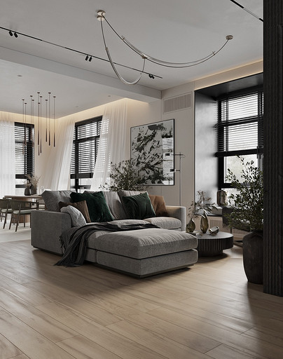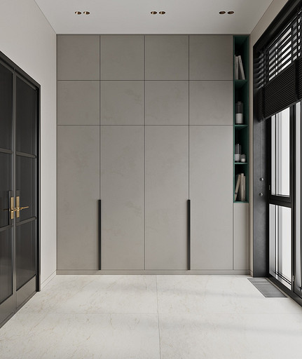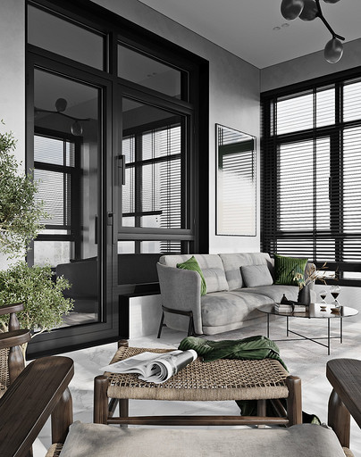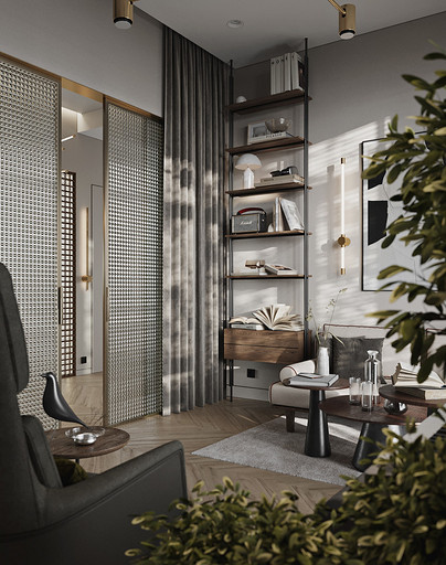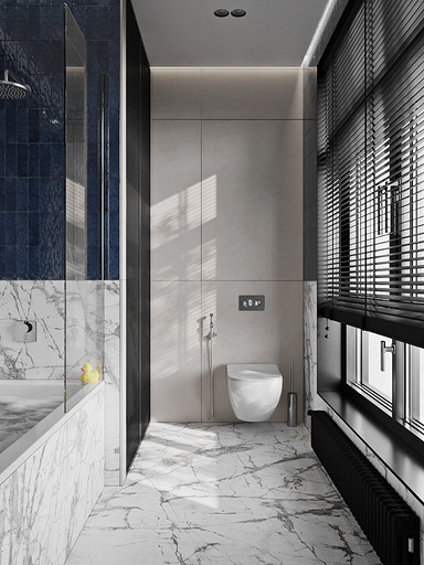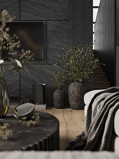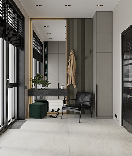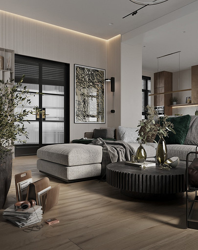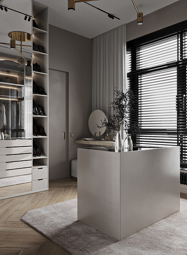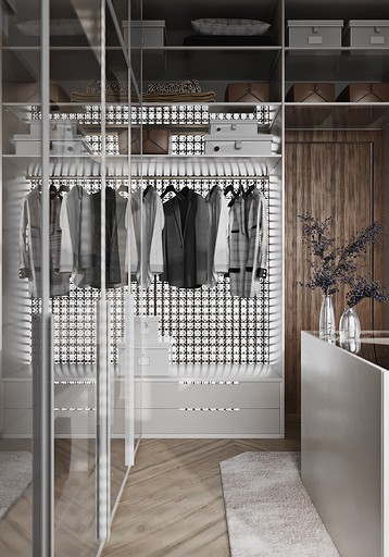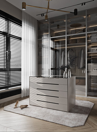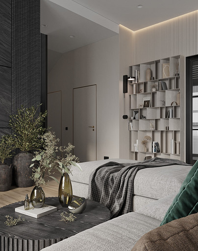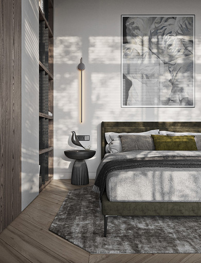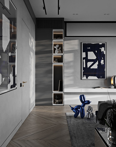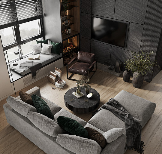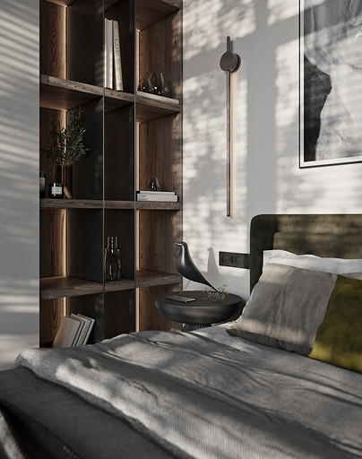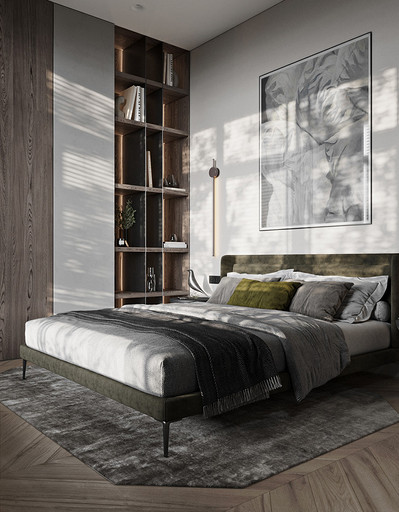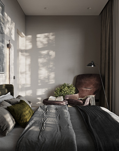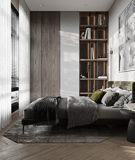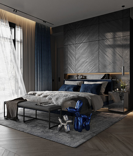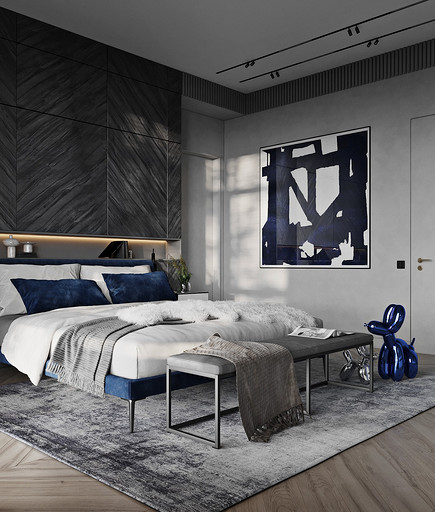 Проект загородного дома для большой семьи. Интерьер, где можно жить и работать в окружении леса. Дизайн интерьера идеального пространства для красивой жизни и комфортной работы. В главной спальне создана обволакивающая атмосфера, благодаря серому цвету и добавленному к нему глубокому синему.