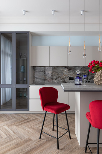 - Мебель: корпусная мебель сделана на заказ, стулья — собственность хозяйки (заменили ткань), Hauska, столик Richmond