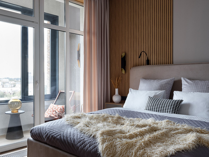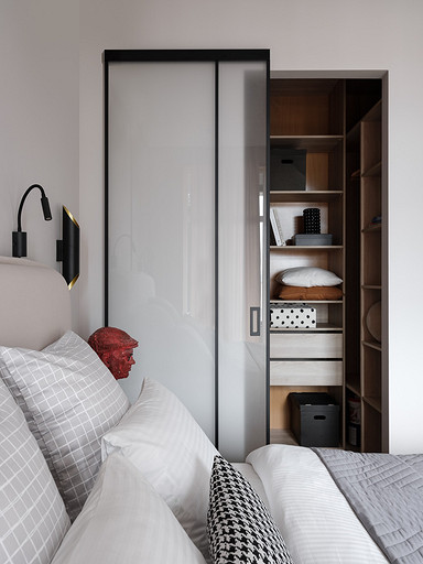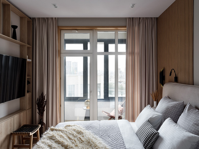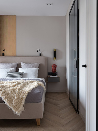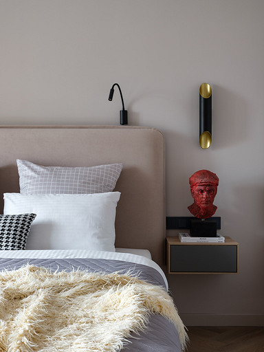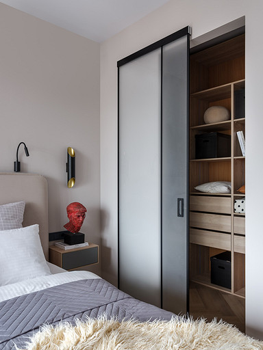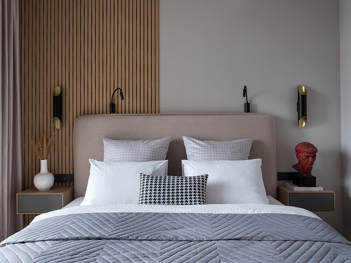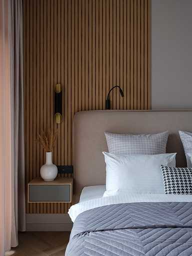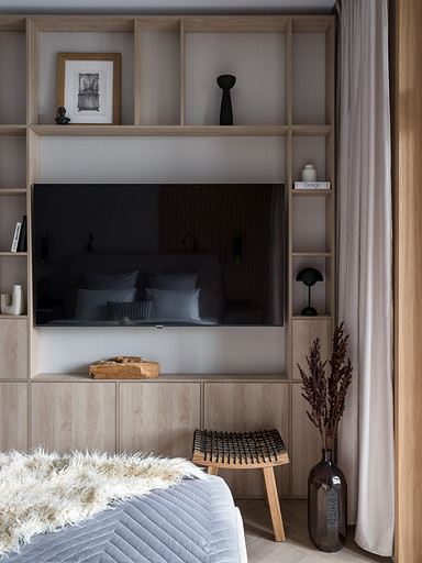 - Мебель: стеллаж и прикроватные тумбы сделаны на заказ по эскизам дизайнера, кровать SK Design, табурет ИКЕА