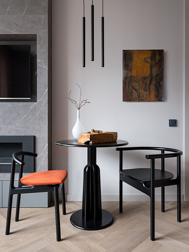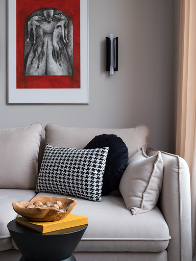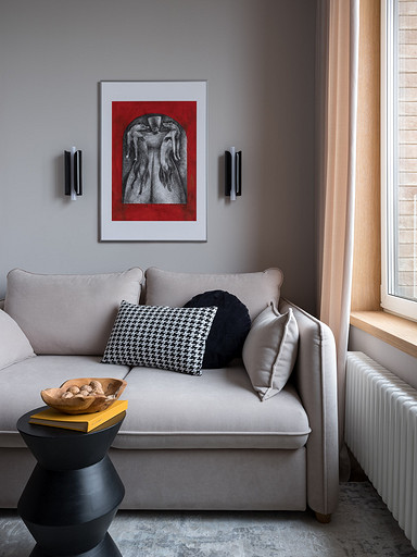 - Декор: металлическая картина над столом — «Наездница» Алексея Дмитриева, картина над диваном — «Опричник» Алексея Дмитриева, керамика Lifey Home, кашпо и растение Treez Collection