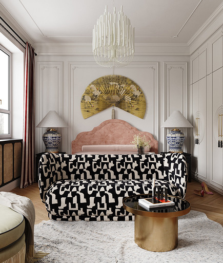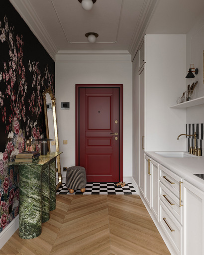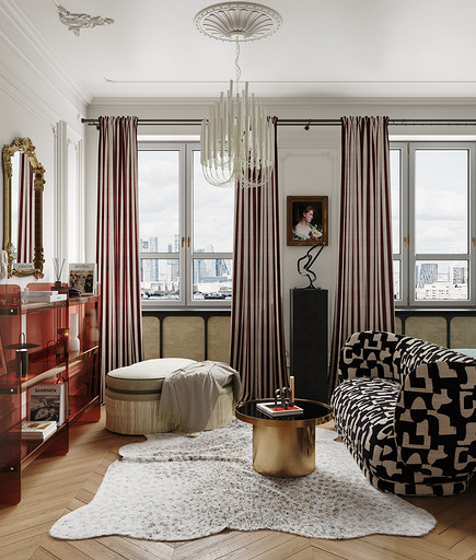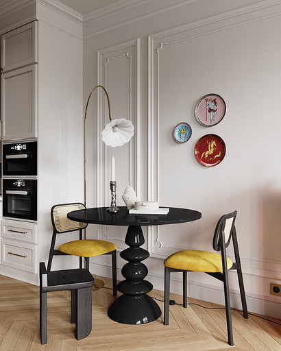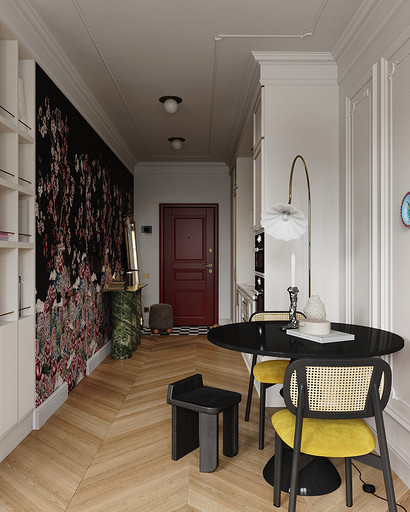 Ко мне обратились мои постоянные заказчики с запросом — оформить квартиру, подаренную дочери на совершеннолетие. Главным пожеланием заказчиков было создать для дочери эстетичное и функциональное пространство, которое отражало бы ее характер и увлечения. Хозяйка студии учится в Париже, но 4 месяца в году проводит в Москве. Планировка от застройщика полностью устраивала заказчицу, поэтому мы лишь передвинули дверной проем в ванной. Расположение кухни в прихожей позволило выкроить место для небольшой гостиной и полноценной зоны для сна. Белоснежные чистые стены с молдингами выступили в качестве фона для ярких цветовых акцентов в мебели с декоре.