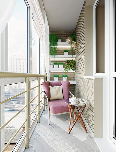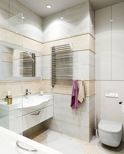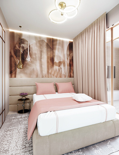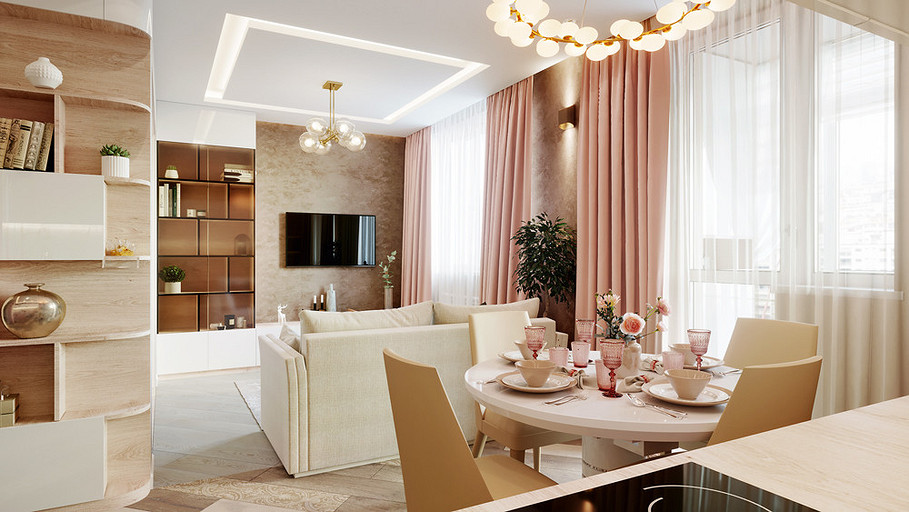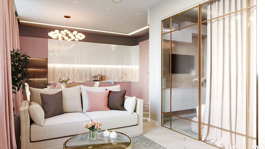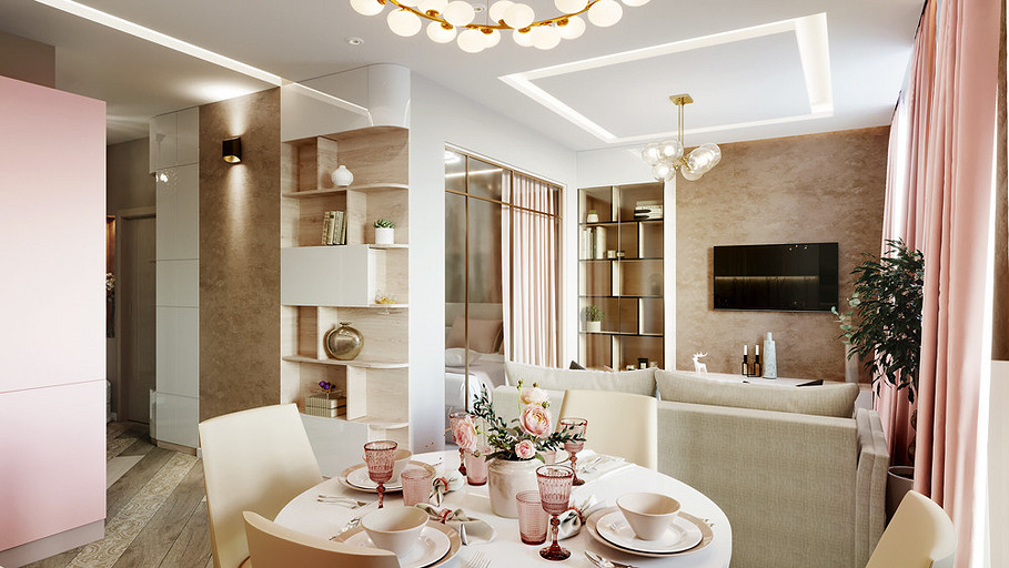 Благодаря новой планировке в однокомнатной квартире появляются объединённые кухня, столовая и гостиная, небольшая изолированная спальня, совмещённый санузел и две гардеробные. Стиль оформления — контемпорари, цветовая палитра составлена из нежных пудровых оттенков.