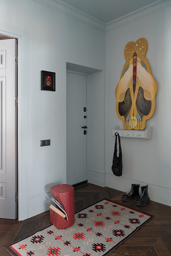 - Декор: картина в столовой и картина с гранатами в прихожей — Эльмира Мухтарова, арт-объекты в спальне и прихожей — Наталья Головащенко, графика — Наталья Губина, миниатюрный холст в гостиной — Ольга Антропова, графика в коридоре — Катерина Белявская