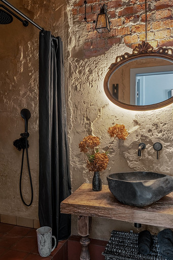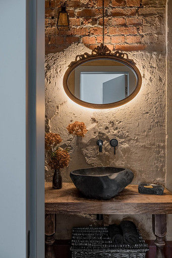 - Сантехника: раковина из натурального камня сделана на заказ, унитаз Lavinia Boho, смесители AltroBagno