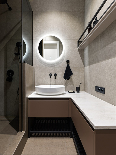- Сантехника: душевой комплект AM.PM, раковина Ceramica Nova, смеситель Boheme, душевой лоток Tece, душевое ограждение сделано на заказ