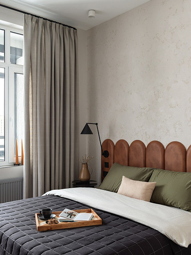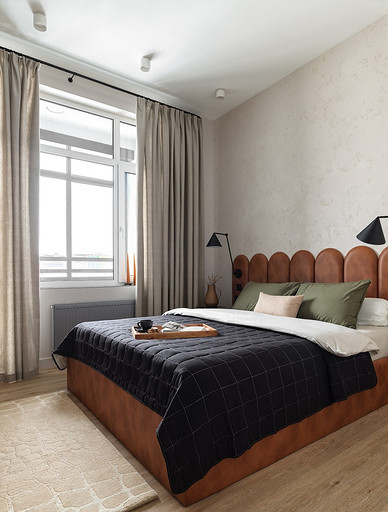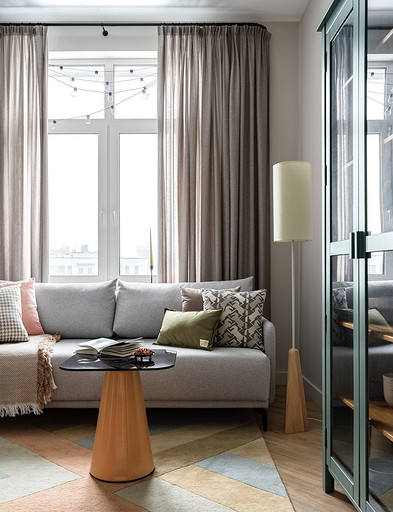 - Шторы: ткань Espokada, пошив — студия Галины Мининой, карниз «Уют»