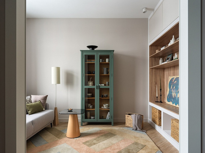 - Декор: мятная ваза YaDoma, картина — галерея Artmaley Roma Tundo, серия Pagmalupitans, картина в стеллаже — галерея Artmaley ElL.IM «Слово», плетеные ящики в стеллаже La Redoute