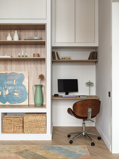 - Мебель: встроенный стеллаж и рабочая зона сделаны на заказ в Panda-Banda, посудный шкаф, журнальный стол и рабочий стул La Redoute, диван и часть подушек SK Design