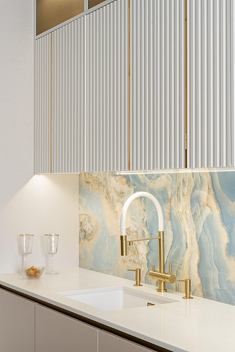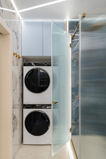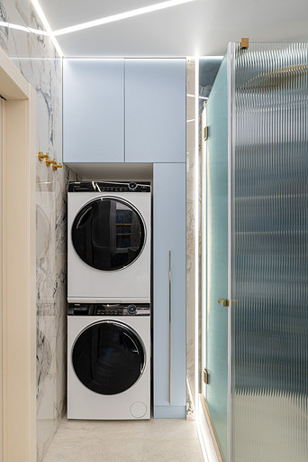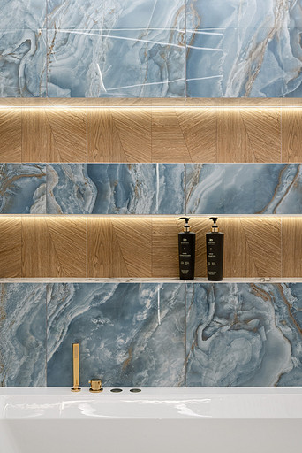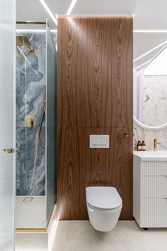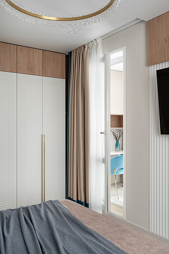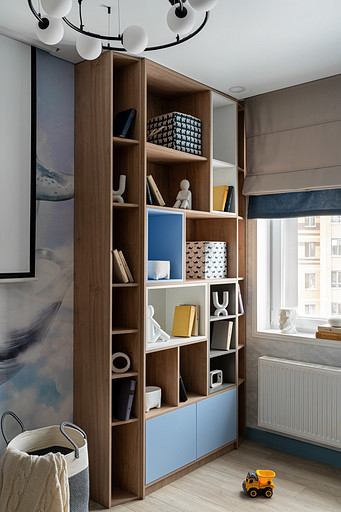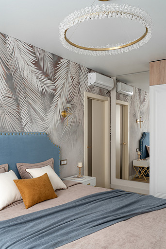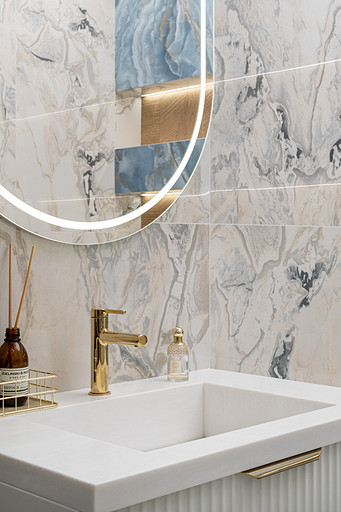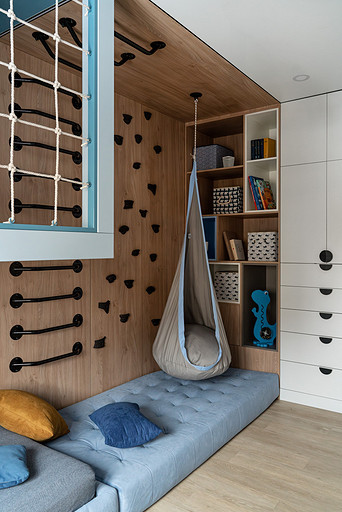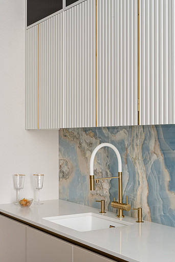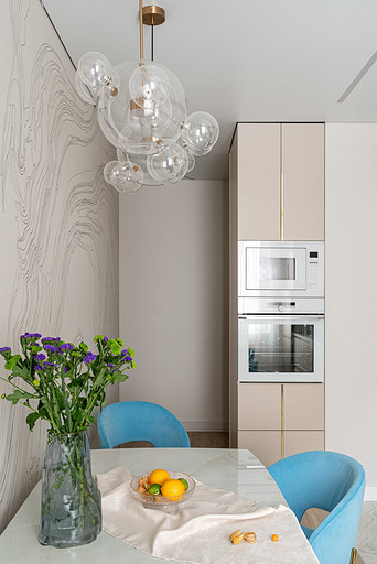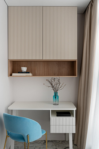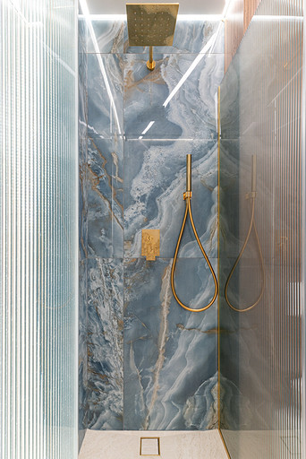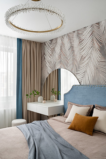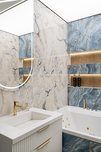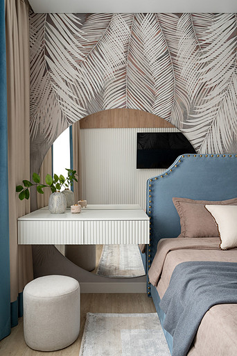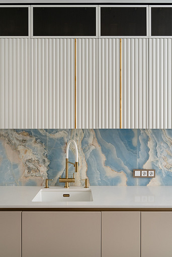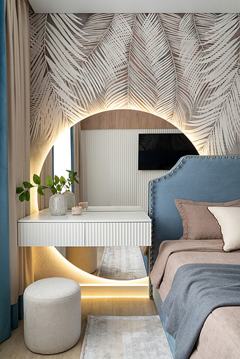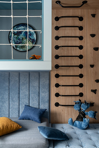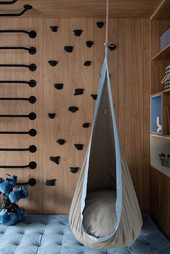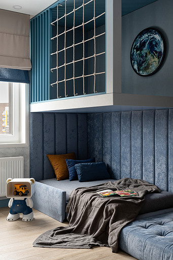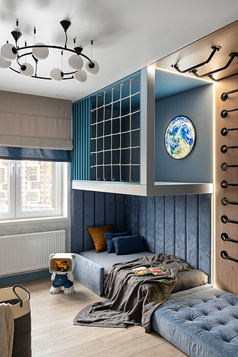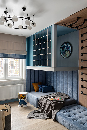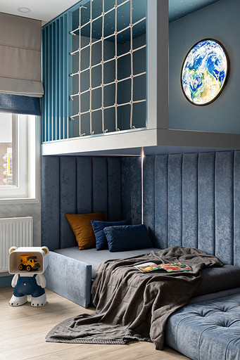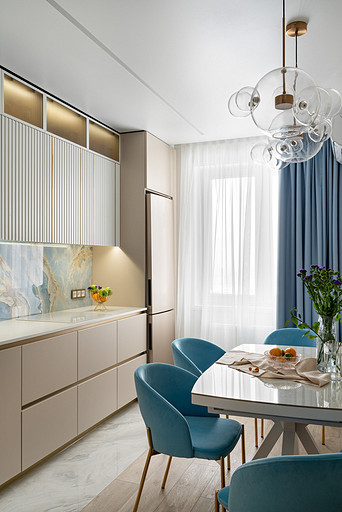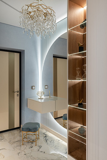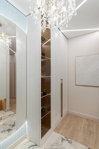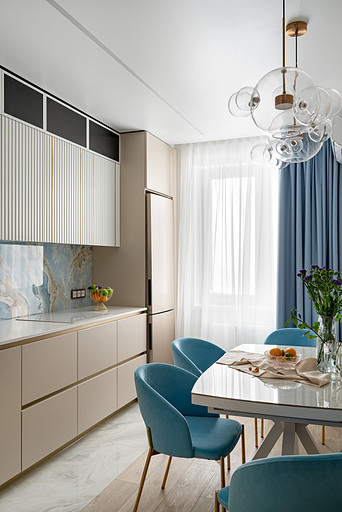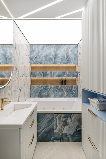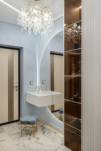 Квартира 81 м2 в новом ЖК Миракл г.Казань Проект 2023 года. Реализация 2023 год. Квартира для семьи с одним ребенком 5 лет. Была сделана частичная перепланировка. Объединили ванную комнату с санузлом, за счет коридора немного расширили ванную комнату. От клиентов не было четкого тех. задания. Из основных критериев были «современный» интерьер в бело-голубой гамме, «нет» черному цвету. Еще одним пожеланием и, можно сказать, мечтой хозяйки дома, чтобы у ее сына был игровой комплекс и двухуровневая спальная зона. Это было непростой задачей, с учетом чистовой высоты потолков в 2.6 м. Так в детской мы еще на этапе черновых работ вживили в стену и потолок металлокаркас, который способен выдержать более 300 кг. Обшили его мебельными панелями и реализовали спальное место с мягким ограждением, а выше появилась игровая зона. Как некий домик, где ребенок может спрятаться или почувствовать себя на космическом корабле. Потому как окружение в виде ночника-планеты и потолка «звездное небо» его погрузит в эту атмосферу. В квартире спроектировано много систем хранения. Все они четко распределены функционально. Большой парящий шкаф с нишей для обуви, подвесная консоль, шкаф со стеллажом и это только системы хранения на входе. Отдельная зона в ванной с колонной, где стиральная и сушильная машины, а рядом выдвижной ящик для хранения бытовых нужд. Важный момент, что отделке ванной комнаты использовано 4 разных керамогранита, которые вместе дают прекрасную синергию и гармонию. Особого внимания требует отделка фартука на кухне- это настоящий оникс. Удивительно, но его рисунок и невероятно нежный голубой цвет создала сама природа. По выбору этого камня была небольшая казусная история. В проекте на фартуке должен был быть керамогранит под оникс белого цвета. Я выбирала для клиентов столешницу на кухню, согласовывала материалы с ними по фото и видео. Мы не могли прийти к консенсусу, и клиенты решили приехать в салон, посмотреть все вживую. Так как салон, в котором мы подбирали образцы имеет еще и свой цех для обработки искусственных и натуральных камнем, мы пошли в цех и на улицу оценить слэбы камня для столешницы в полноразмерном формате. И там на улице стоял кусок того самого слэба оникса. Я видела его заранее, он действительно приковывал внимание, но я понимала, что оникс хрупкий, пористый, дорогостоящий материал совершенно непригодный для кухни. Клиенты же увидели этот камень и просто не смогли уйти без него. И то, что это непрактичный материал для кухни, не было для них помехой. Потому что большую часть времени приемы пищи у этой семьи происходят вне дома. Из минусов этой квартиры был длинный и узкий коридор, который мы не могли никак перепроектировать. Я не хотела делать это пространство невзрачным, наоборот сделала световой акцент на данном пространстве. Потому что считаю, что каждое пространство должно радовать и приносить эстетическое удовольствие. Отделка коридора нейтральная, но, когда включается свет, то происходит магия. Один из сценариев освещения — это плинтуса с подсветкой, которые работают от датчиков движения. Чтобы ночью было комфортно дойти до ванной комнаты и вернуться обратно в комнату без травматизации. Второй сценарий света — это ломаные световые линии на потолке. Все потолки в квартире с теневым профилем. И это особо сложная задача была в 
