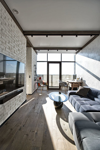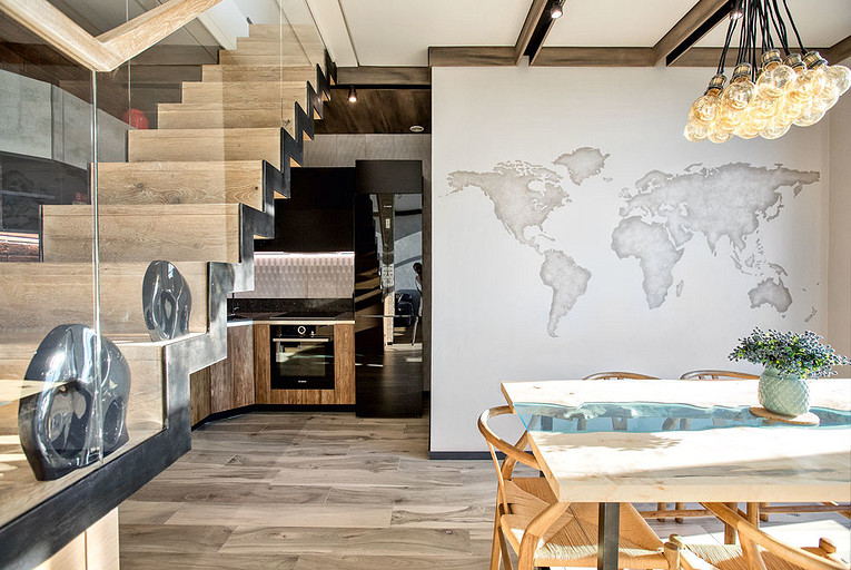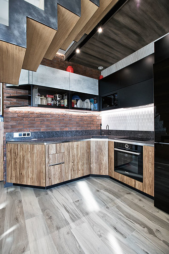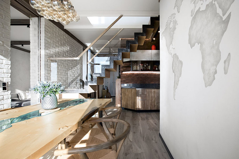 - Мебель: кухня — по эскизам авторов проекта «Спутник Стиль», столешница — агломерат Samsung, стол — столешница Loft Design, каркас PM-studio