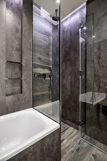 - Пол: инженерная доска — дуб Finex, плитка керамогранитная Kerama Marazzi