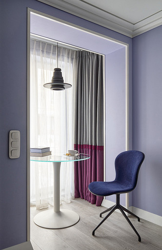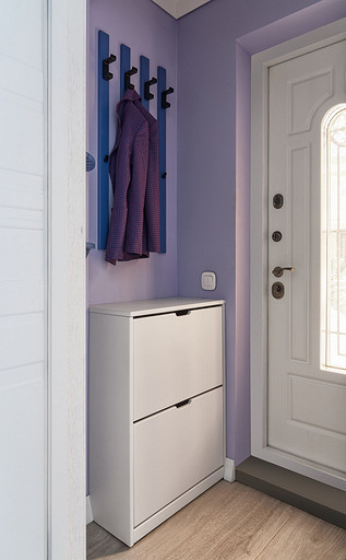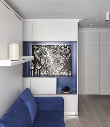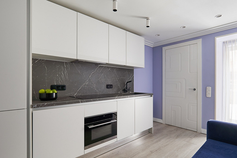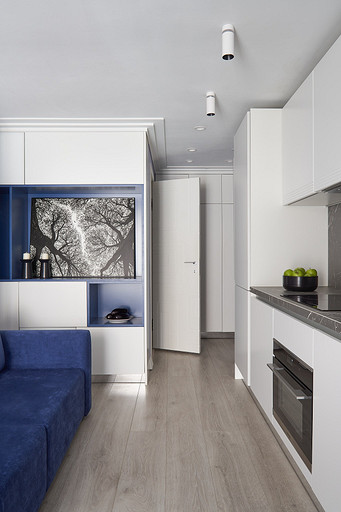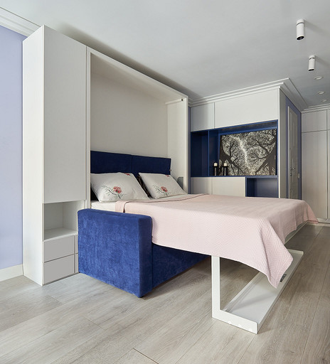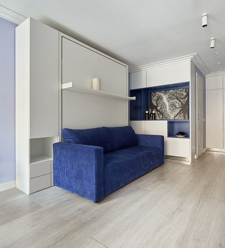 Главная «фишка» проекта – обустройство полноценной студии со всем необходимым для жизни, в бывшем гараже обычного таун-хауса в Подмосковье. Чтобы помещение было более просторным, я использовала светлые цвета стен и светлую мебель. Но важно было сделать помещение современным и ярким, не скучным для молодого человека. Яркие акценты – мягкая мебель, текстиль, оформление санузла.