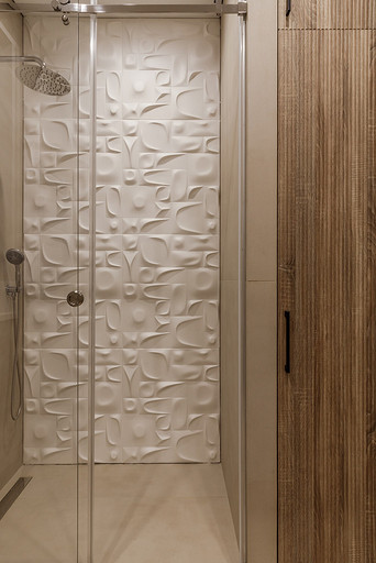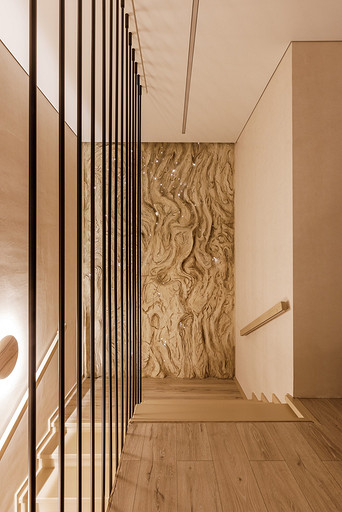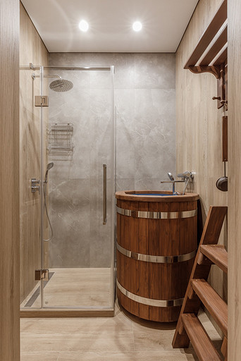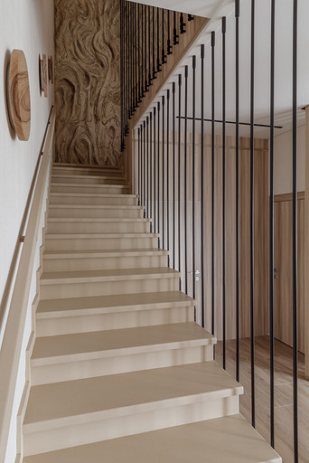 - Стены: стеновые панели и рейки Estet, декоративная штукатурка Flugger, бесшовная фреска Wall Street, 3D-панели дизайн-студии Artefact, виниловые обои на флизелиновой основе Erismann, в сауне — деревянная вагонка из липы, в санузле первого этажа — L'Antick