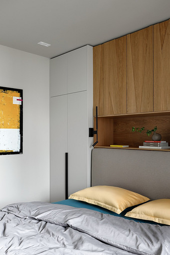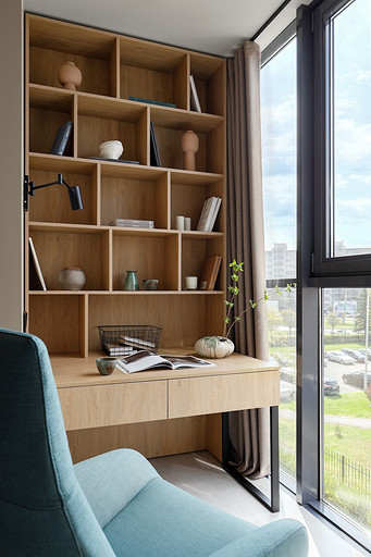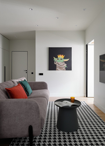 - Декор: в прихожей, спальне и зоне обеденного стола панно, геометрический абстракционизм Евгении Балдиной, в спальне сына и гостиной работы художника Лидии Лобкановой