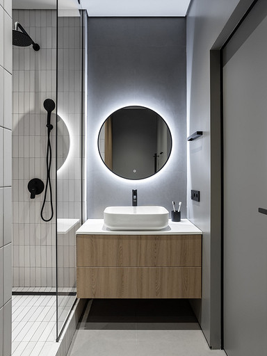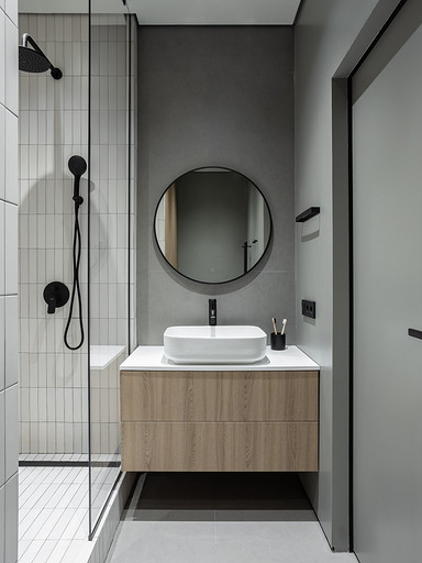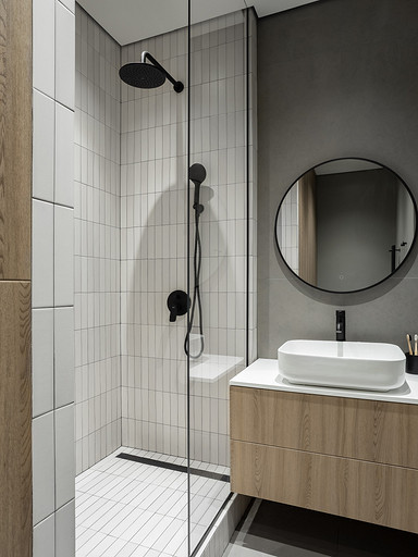 - Стены и пол: плитка DNA Tiles, керамогранит Estima