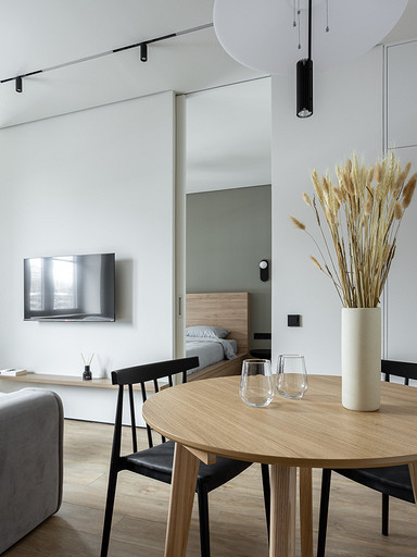 - Стены: диван, журнальный столик и прикроватные столики Stool Group, стулья divan.ru, стол Lagom