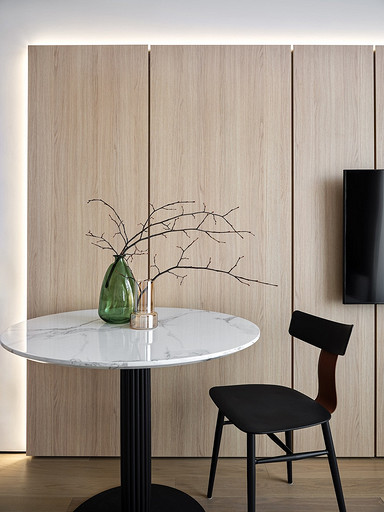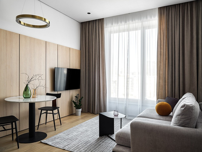 - Мебель: корпусная мебель и панели с подсветками «Стильные кухни» (на заказ по эскизам дизайнера), диван Costa Bella, кровать Nuvola, стол и стулья Stool Group