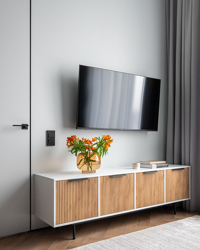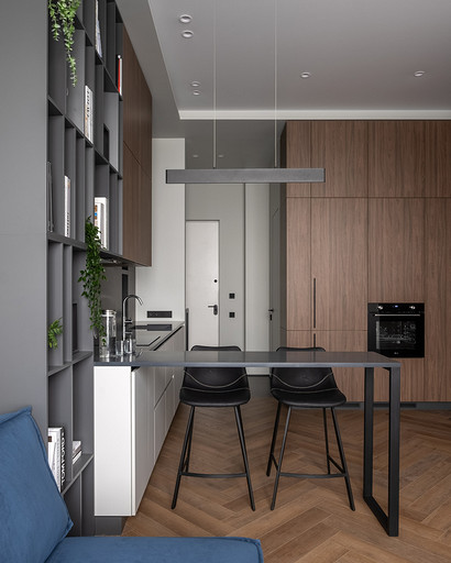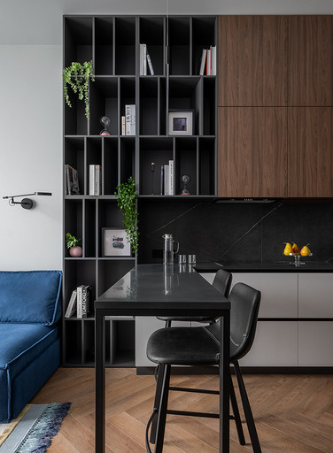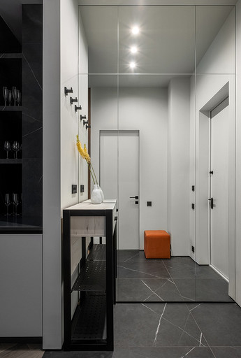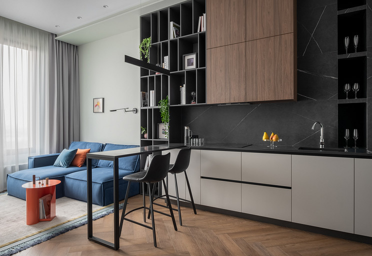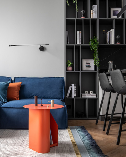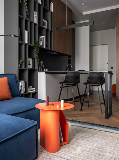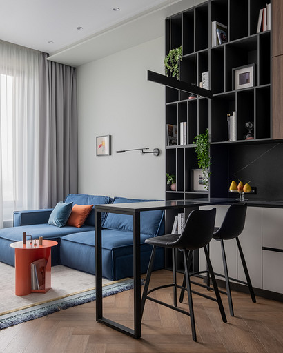 Недавно мы реализовали интересный проект дизайна однокомнатной квартиры для клиентки, которая планировала сдать ее в аренду на длительный срок. Наша работа началась с перепланировки, целью которой было сделать небольшое пространство максимально функциональным. Прихожая стала отправной точкой нашего проекта. Мы установили зеркальную стену, которая создала впечатление увеличения пространства, и добавили функциональные элементы, включая обувницу и пуфик. Благодаря перепланировке нам удалось поместить гардеробную неподалеку от прихожей. Кухня-гостиная стала центром квартиры, и мы обеспечили ее большим количеством места для хранения. Встроенные шкафы с бытовой техникой, специально организованные пространства для продуктов и стиральной машины с корзиной для белья — все это было продумано до мелочей. Разделение кухни и гостиной сделали барной стойкой и декоративным стеллажом, а яркий диван стал неотъемлемым акцентом помещения. Изменив вход в спальню, мы добавили встроенный шкаф для хранения хозяйственных принадлежностей. Ванная комната была тщательно продумана с учетом удобства использования. Над инсталляцией мы разместили шкаф с полками для химии, а ванную оборудовали встроенными полками и дополнительным светом. В спальне благодаря перепланировке мы разместили три шкафа воплотив в жизнь пожелания клиентки и создав уютное и функциональное пространство.