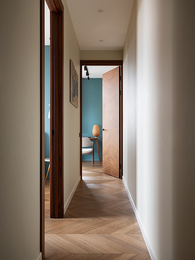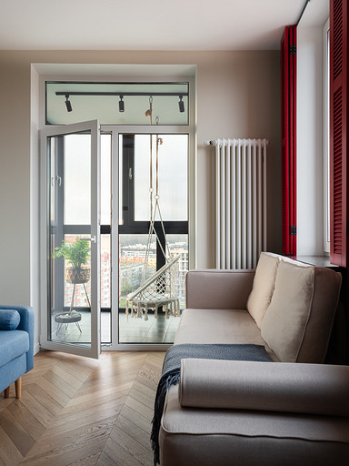 - Пол: инженерная доска «Паркет Элит», плитка в прихожей и ванной Kerama Marazzi, плитка на балконе Mainzu