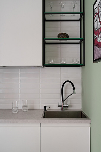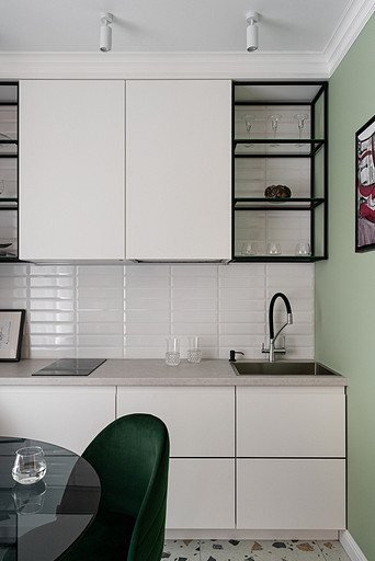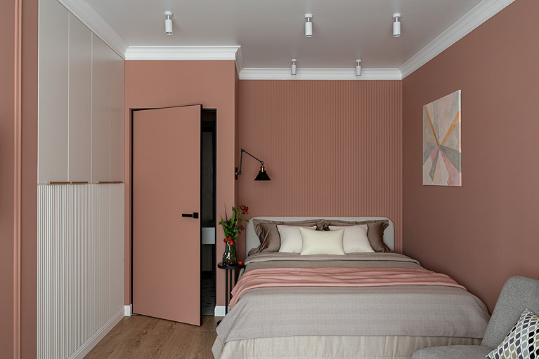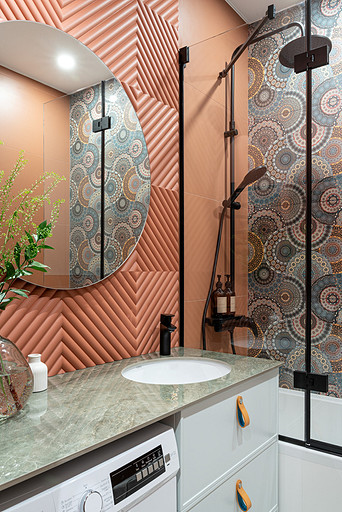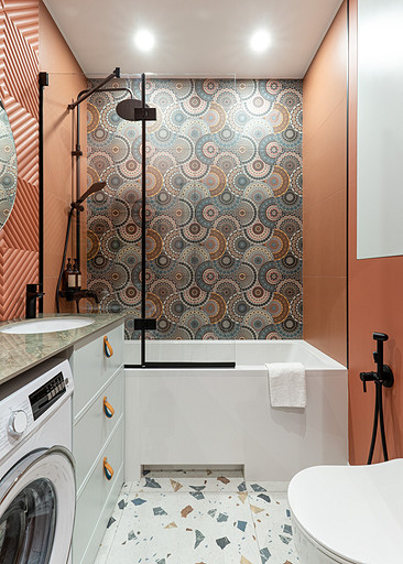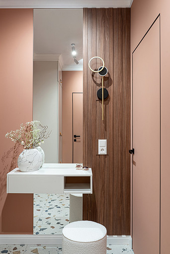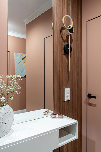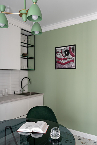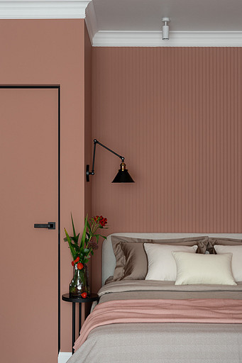 - Стены: краска Mons, декоративные панели Orac Decor, керамогранит Ceracasa