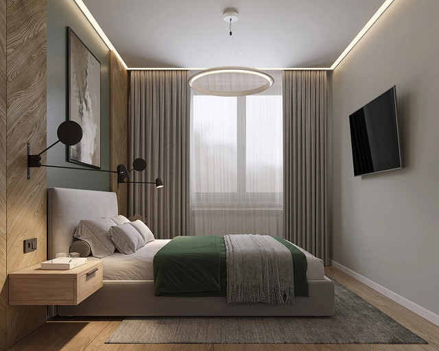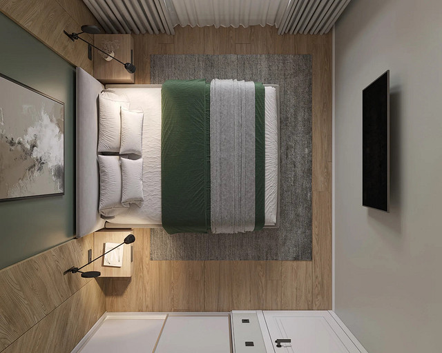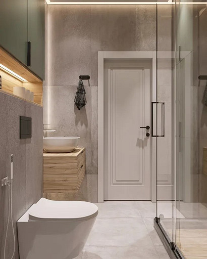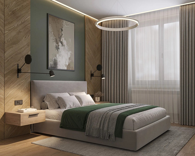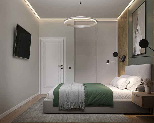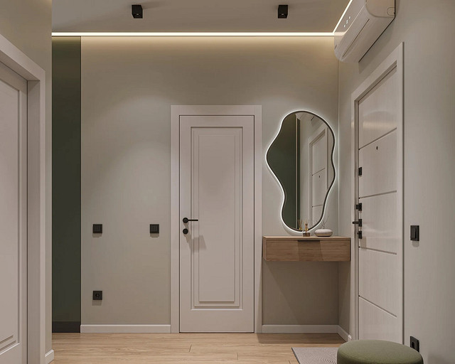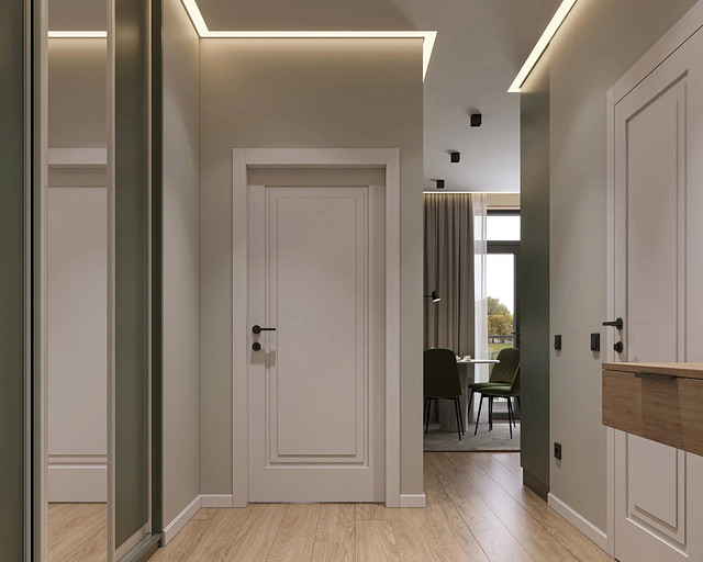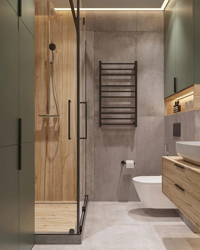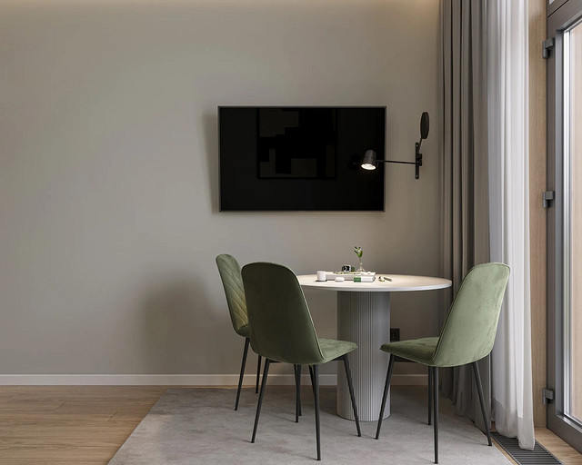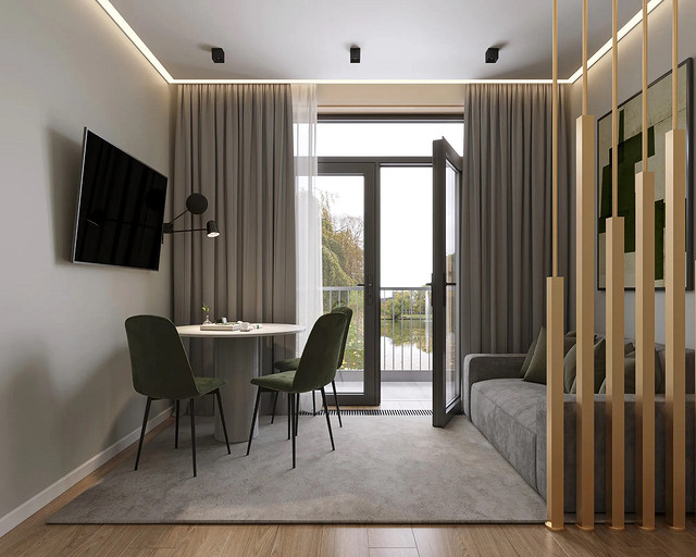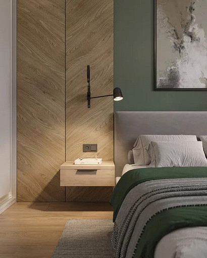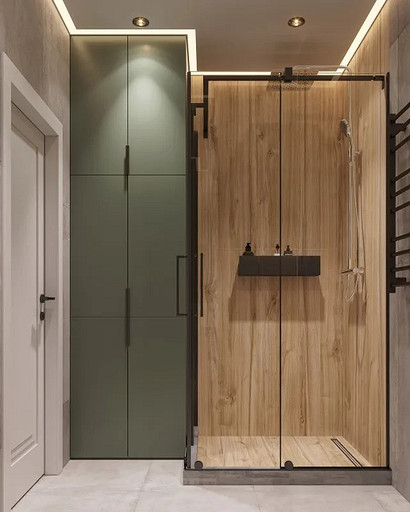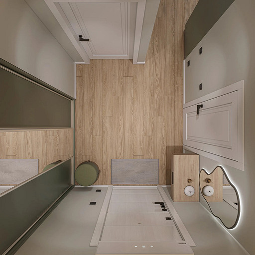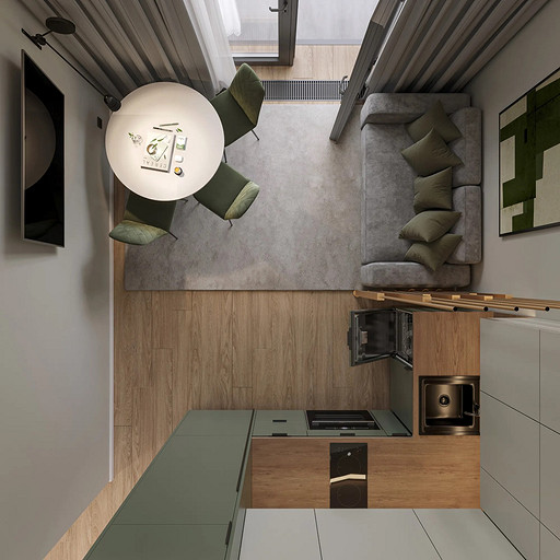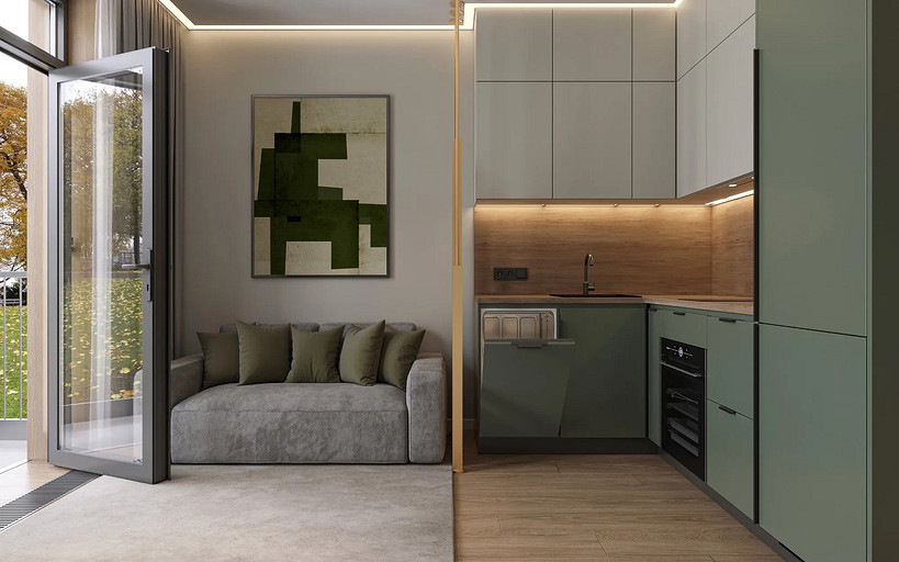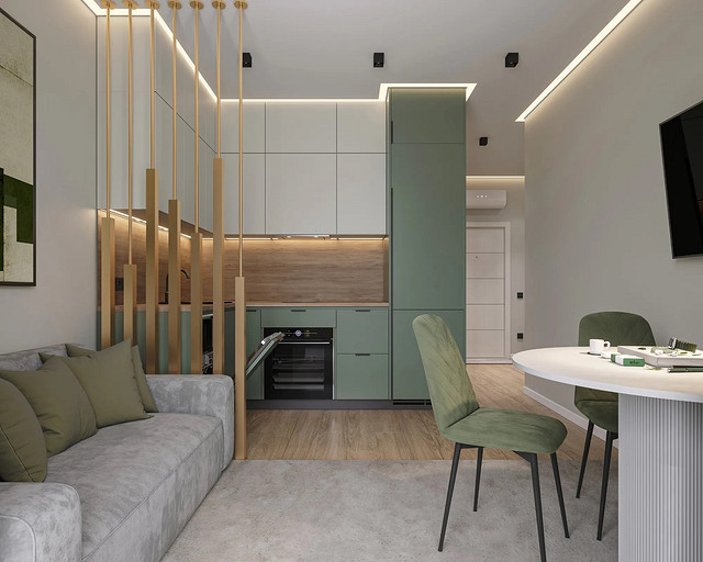 Однокомнатная квартира, площадью 34кв.м. Весь дизайн квартиры завязан на оливковом цвете и деревянных элементах. При входе сразу встречает просторная прихожая, где великолепно вписываются большой оливковый шкаф, небольшой пуф, зеркало с подсветкой. На кухне холодильник и нижние шкафчики также выполнены в оливковом цвете, гармонично дополняя общий интерьер. Фартук и столешница под дерева добавляет натуральности и теплоты к зоне кухни. Реечная перегородка, разделяющая зону кухни и гостиной, придает интерьеру легкость и воздушность. Диван с оливковыми подушками и стол с мягкими стульями этого же цвета создают уютное место для отдыха и общения. Стена в спальне отделана панелями под дерево, а бра над кроватью создают мягкое и расслабляющее освещение. Вместительный шкаф в спальне обеспечивает достаточно места для хранения одежды и личных вещей. В санузле также используется оливковый цвет и дерево, сочетая в себе функциональность и красоту. Много места для хранения делает этот уголок квартиры удобным и практичным.