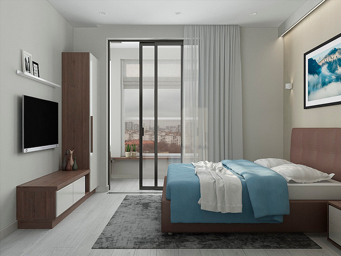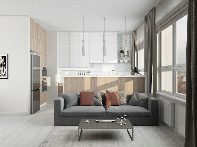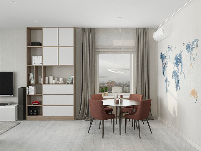Дизайнеры предлагают оформить небольшую квартиру для холостяка в сдержанной цветовой гамме и с минимумом деталей. Основной упор делается на фактуры и отдельные акценты, вроде карты мира на стене, которые выдают в хозяине активного и современного горожанина.