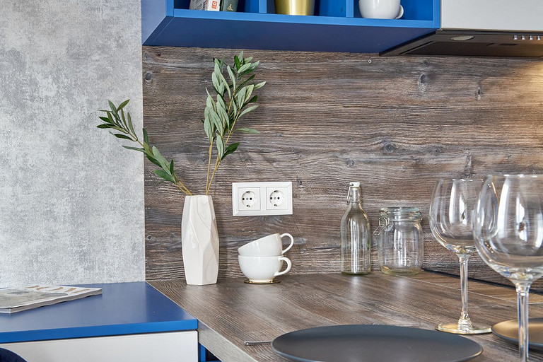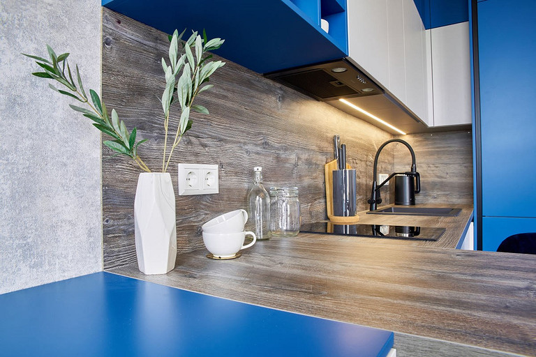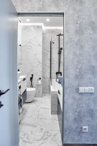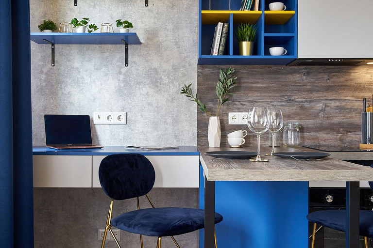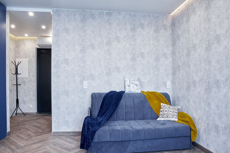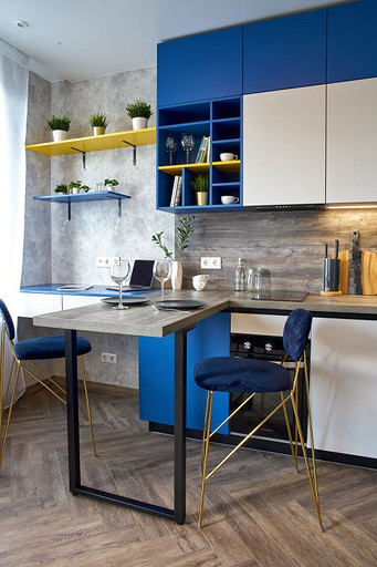 У заказчиков был небольшой бюджет, им было важно сделать дизайн студии под сдачу в аренду. Студия всего 27м2. Стиль – современный. При работе с такими маленькими пространствами важно грамотно распланировать и кухню, и обеденную зону, и рабочее место, и место отдыха. Для студии выбрали 3 основных цвета – серый, синий и желтый для выделения акцентов. Кухня в проекте серая с синими фасадами. Сюда мы встроили холодильник, выделили место под посудомоечную машинку, разместили духовку и варочную поверхность на 2 конфорки. Для декора был сделан открытый стеллаж и 2 полки на стене. В зоне кухне мы разместили барную стойку. Рабочее место хоть и небольшое, но функциональное. Под столом расположены 2 выкатных ящика, которые открываются от нажатия. Сюда поместятся канцелярские предметы, книги, журналы, блокноты и тд. Санузел оснащен ванной с душевой перегородкой, комодом для хранения белья, стиральной машинкой под столешницей с раковиной, шкафом для хранения бытовой химии. Вся сантехника черная, для поддержания такой концепции мы использовали черную мебельную фурнитуру. В зоне отдыха мы поставили мягкий диван.