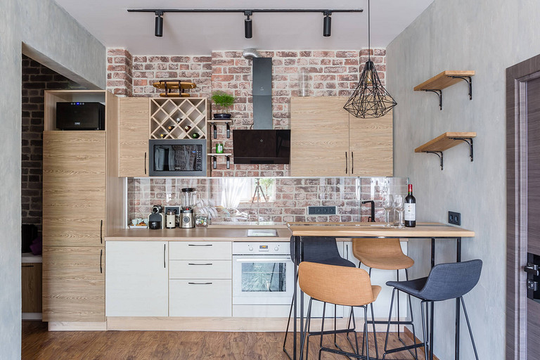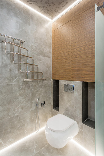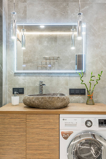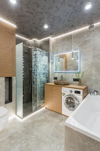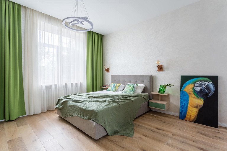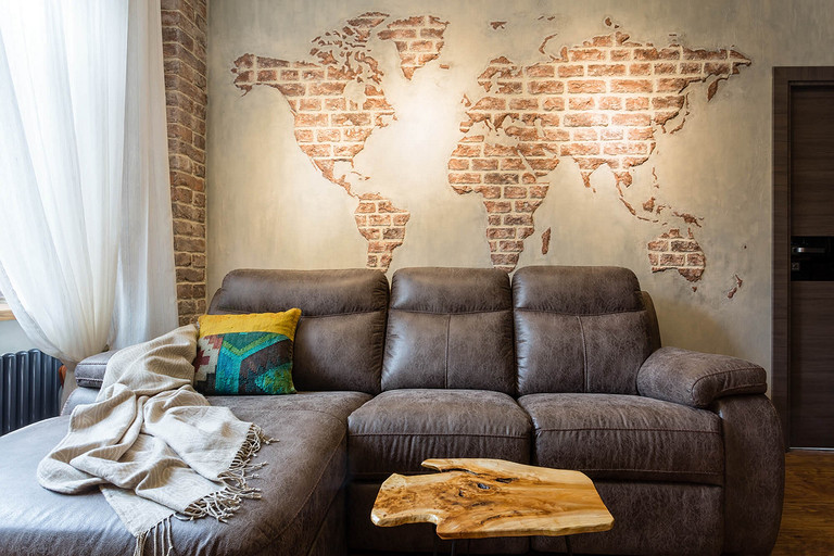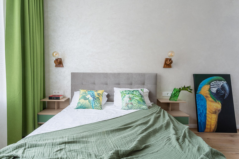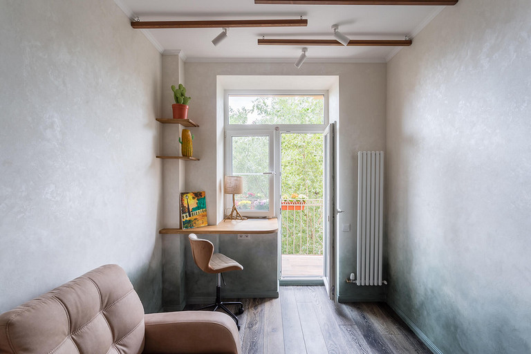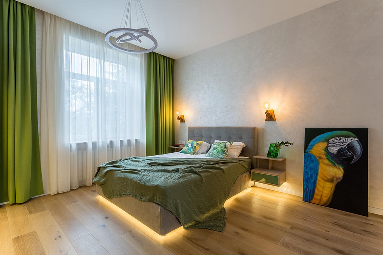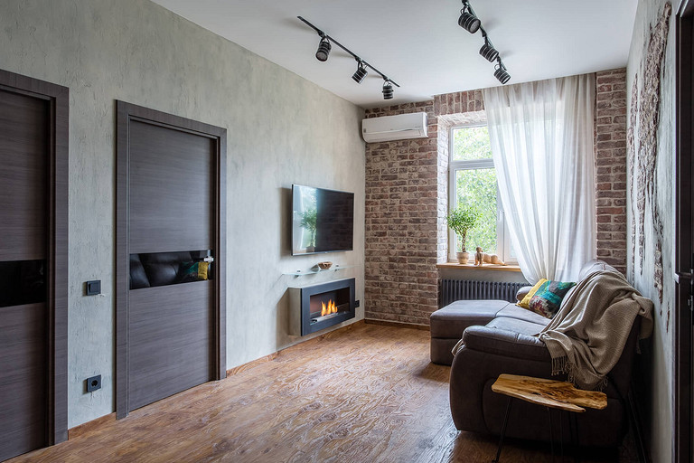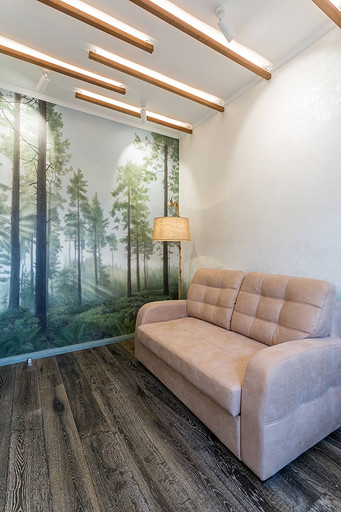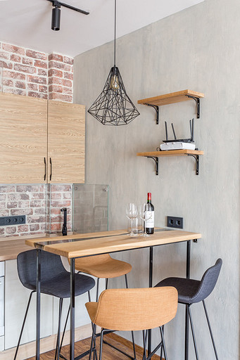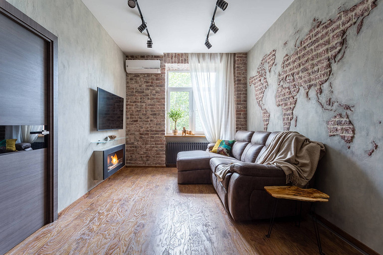 Дизайн представленной квартиры выполнен с помощью эклектики двух стилей — Контемпорари и Лофт, являющихся самыми популярными направлениями 21 века в области интерьера. Отличительная черта пространств, оформленных в этих стилях, – природные, натуральные материалы, такие как – дерево, камень, глина, кожа и хлопок. И Контемпорари, и Лофту свойственна естественная цветовая гамма – бежево-коричневые, серые, зелёные оттенки. Кроме того, неотъемлемыми признаками этих современных течений можно назвать обилие света, сочетание текстур, геометрические примитивы, отсутствие ярких акцентов, помпезности и узорности, а также минимум мебели. Для создания большей функциональности и придания воздушности помещения было принято решение совместить кухню и гостиную. На месте первой организовали рабочий кабинет, а в ванной комнате, благодаря удалению технических перегородок, поместилась не только душевая кабина, но и ванна. Зоны хранения настолько органично вовлечены в общее пространство комнат, что, на первый взгляд, кажется, будто они отсутствуют вовсе. На открытом балконе разместилась зона чаепития. Дополнением к образу стало использование живых растений в каждом из помещений квартиры, что создаёт уют и благоприятную атмосферу для жизни. Благодаря арт-объектам, размещённым в жилых комнатах, интерьер квартиры получился индивидуальным и неповторимым. Так, в зоне отдыха кухни-гостиной разместилась стилизованная карта мира, выполненная из кирпича. Изголовье кровати в спальне оформили деревянным панно, представляющим собой светящиеся многоугольники, отличные друг от друга по форме. Потолок кабинета украсила подсвечиваемая композиция из тёмных реек, в продолжение идее утреннего леса, изображённого на стенах при помощи аэрографии. Для того чтобы интерьер квартиры или дома получился законченным и уютным, необходимо продумать каждый его элемент. Выбрать из миллионов предложений рынка только то, что действительно гармонирует с другими объектами пространства. Это очень важно сделать атмосферу благоприятной, ведь результат дизайна будет отражаться на самочувствии находящихся в ней людей.