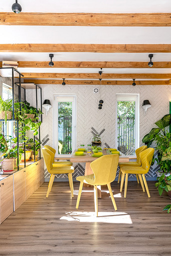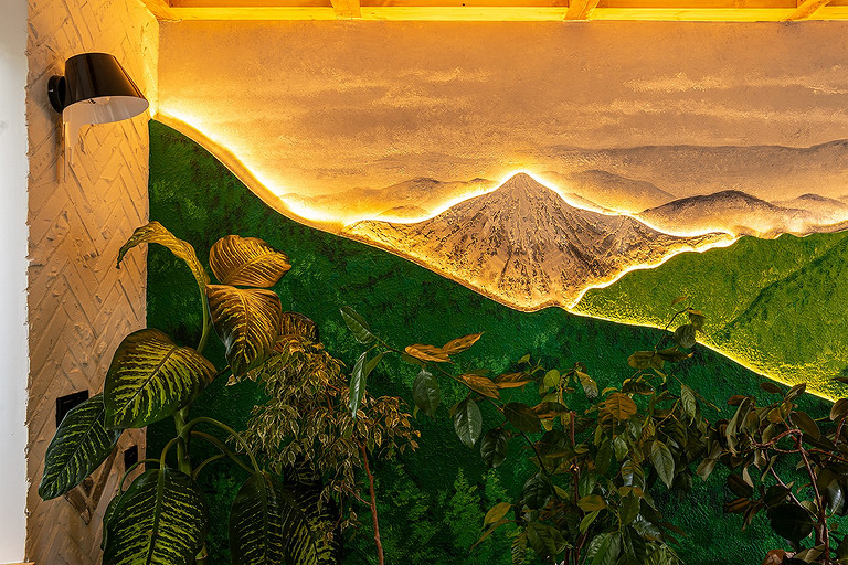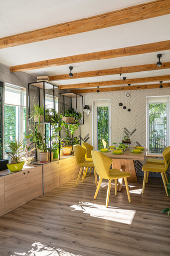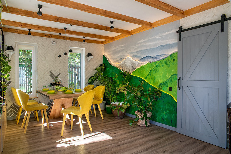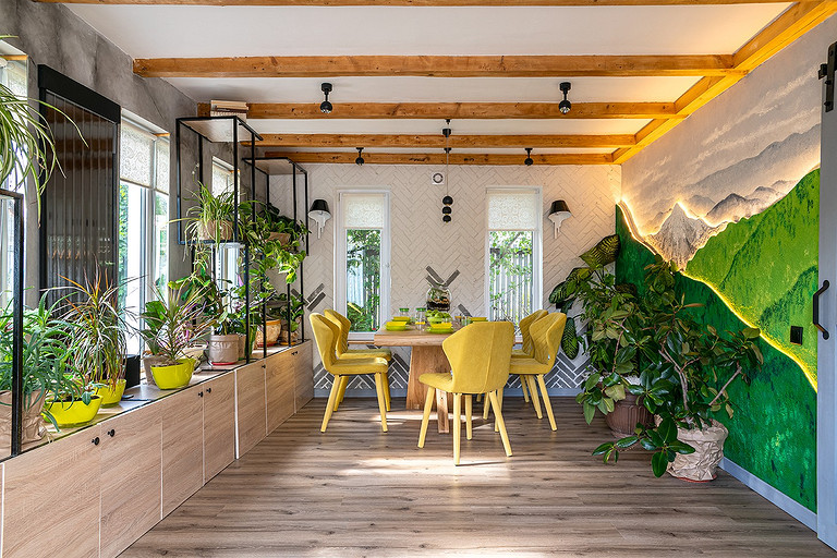 Я принимала участие в программе «Фазенда Лайф». Задачей было сделать уютное пространство для приятного времяпровождения с семьей и друзьями, и по совместительству зимний сад. Мы много трудились над этим проектом, и вы можете увидеть наш результат-зимний сад «Архыз». Для стен мы использовали декоративный кирпич и декоративную штукатурку,что выглядит достаточно стильно и современно. Отлично сюда подошел дизайнерский раздвижной стол из массива дуба, истинные любители дерева точно оценят по достоинству. Для большего комфорта мы решили добавить мягкие стулья, они отлично дополняют интерьер и так же, невероятно удобные и практичные. Мы позаботились и о растительной части интерьера, добавили зеркала для отражения естественного света и пузырьковую панель, которая является отличным увлажнителем воздуха. Так как помещение у нас подвержено излишней влажности, все покрытия мы сделали водонепроницаемыми, пол сделан из кварцвинилового ламината. И самое главное в этом интерьере-акцентная стена в виде горного хребта Архыза со скалистыми вершинами. Стена полностью расписана вручную художницей. Так же, при помощи светодиодной ленты мы подчеркнули уникальность и красоту стены. Интерьер получился достаточно «живым» и уютным. Это приятное место для отдыха с семьей и друзьями.