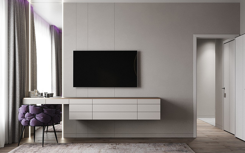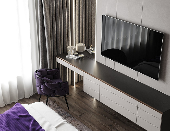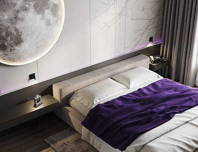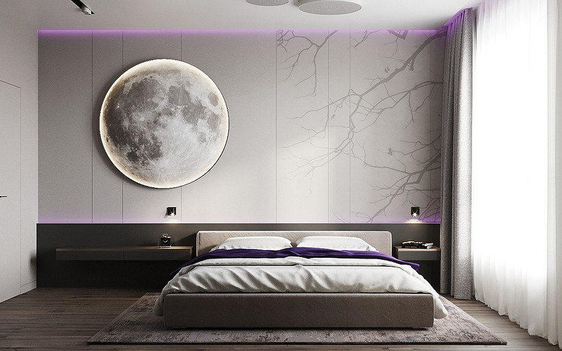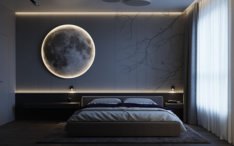 Акцент этой спальной комнаты- это светильник «Луна» диаметром 900. Интерьер разработан в современном стиле