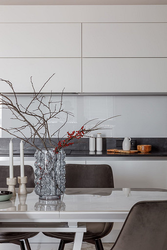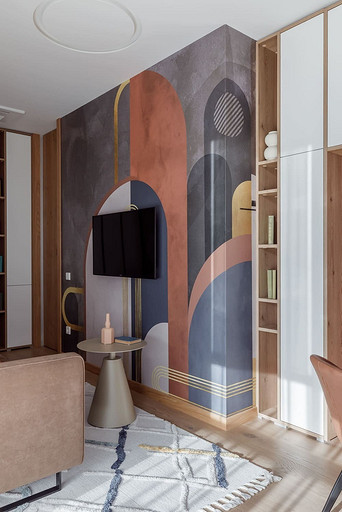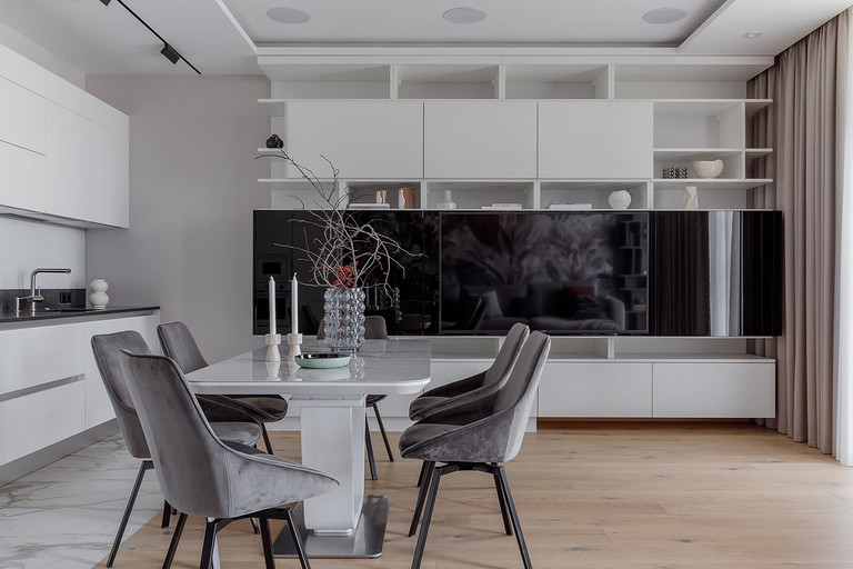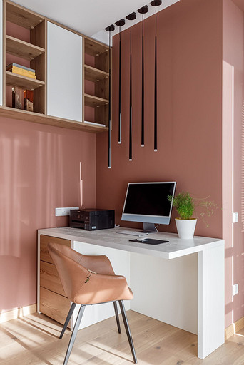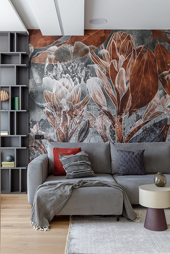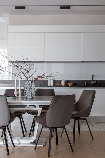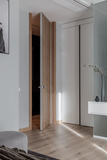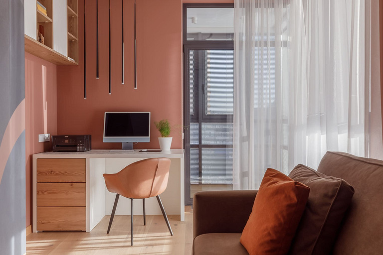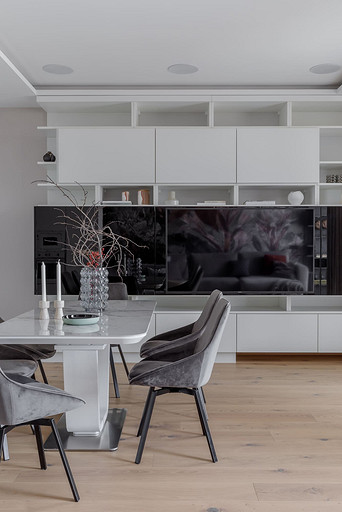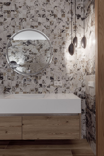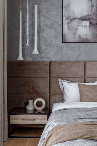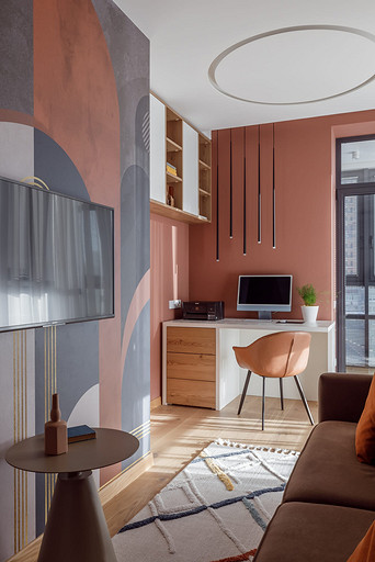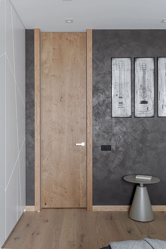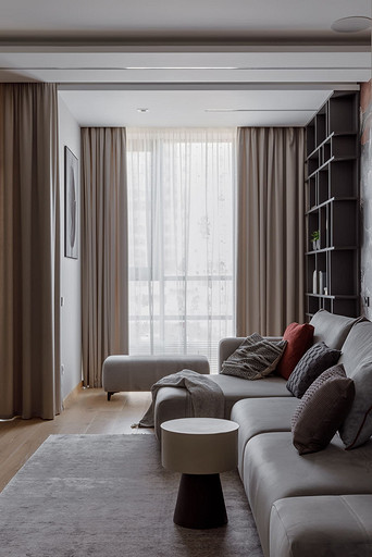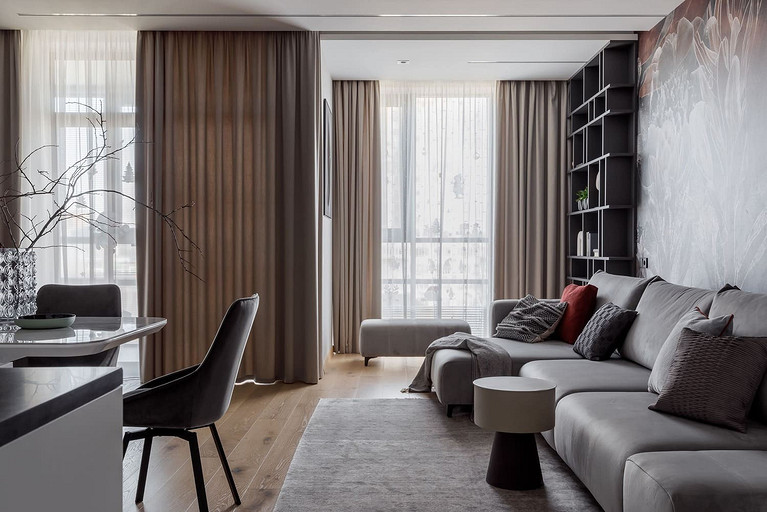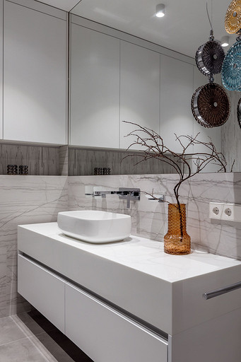 «Мёд» — это слово лучше всего подходит для описания цветовой гаммы проекта. Разнообразные медовые оттенки присутствуют не только в текстурах дерева, но и в мраморе особого сорта на стенах ванной комнаты. Одно из достоинств квартиры — высокие потолки. Его мы подчеркнули дверями на всю высоту, без перемычки над дверью. Такой приём выгодно меняет масштаб помещения, визуально добавляя ему высоты и простора. Часть окон квартиры выходит на солнечную сторону. При жарком ростовском лете это проблема, требующая решения. Рулонные шторы закрывают обзор, а гардины быстро выгорают, но не спасают от солнца. Идеально подошли темно-серые жалюзи: в горизонтальном положении они не портят вид, хорошо отражают солнечное тепло, а их цветовая гамма поддерживает общее стилевое решение. Вся корпусная мебель для проекта изготовлена по нашим эскизам. Это и фрезерованные фасады в детской, и полки с зарезкой под 45 градусов, и ТВ-зона из матового стекла в спальне, и ТВ-зона в гостиной с чёрной глянцевой полосой в качестве фона для телевизора. Для визуального отделения прихожей от кухни-гостиной мы использовали красивое матовое стекло; через него из гостиной в прихожую проникает мягкий рассеянный свет. Стена за диваном украшена огромным цветочным панно в сложных оттенках красного и серого цветов. На стене кабинета — фреска с абстрактными геометрическими фигурами. Декоративная штукатурка и картины служат украшением для стены спальни. В гостевом санузле мы разместили большую душевую зону, широкую столешницу, зеркало, унитаз и места хранения. Отдельный важный момент: доступ к общедомовым коммуникациям скрыт за мебелью. Стены отделаны белым с серыми прожилками мрамором.