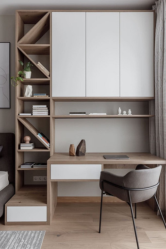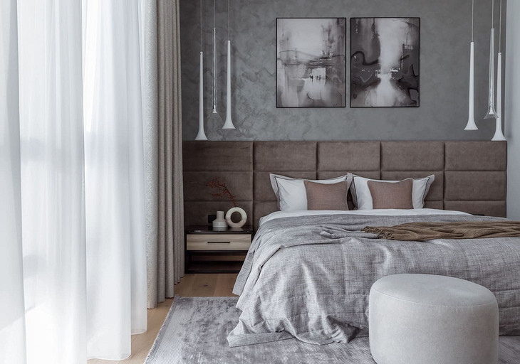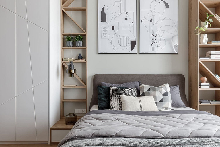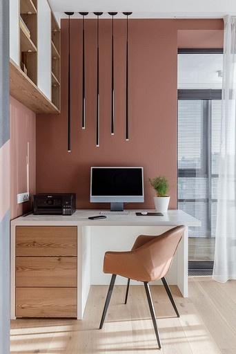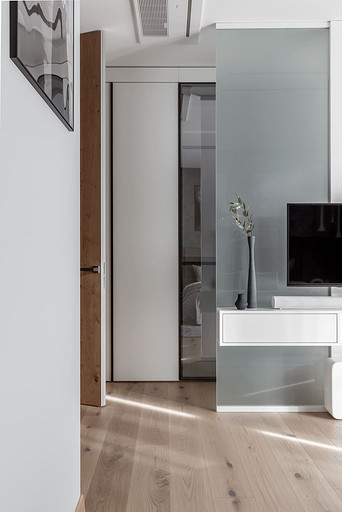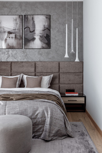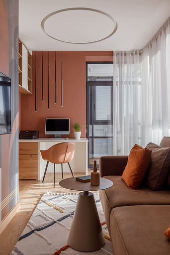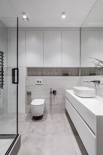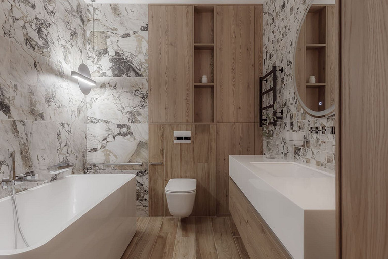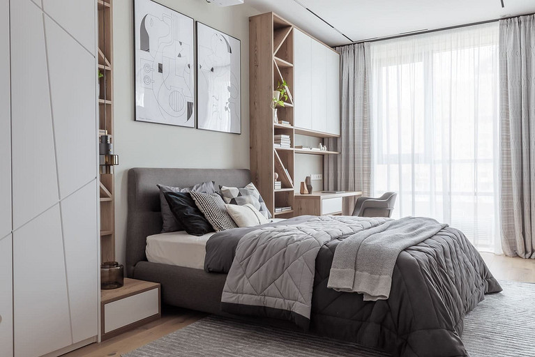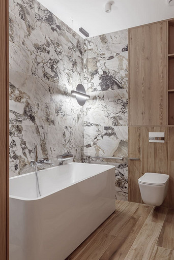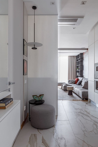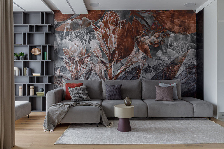 «Мёд» — это слово лучше всего подходит для описания цветовой гаммы проекта. Разнообразные медовые оттенки присутствуют не только в текстурах дерева, но и в мраморе особого сорта на стенах ванной комнаты. Одно из достоинств квартиры — высокие потолки. Его мы подчеркнули дверями на всю высоту, без перемычки над дверью. Такой приём выгодно меняет масштаб помещения, визуально добавляя ему высоты и простора. Часть окон квартиры выходит на солнечную сторону. При жарком ростовском лете это проблема, требующая решения. Рулонные шторы закрывают обзор, а гардины быстро выгорают, но не спасают от солнца. Идеально подошли темно-серые жалюзи: в горизонтальном положении они не портят вид, хорошо отражают солнечное тепло, а их цветовая гамма поддерживает общее стилевое решение. Вся корпусная мебель для проекта изготовлена по нашим эскизам. Это и фрезерованные фасады в детской, и полки с зарезкой под 45 градусов, и ТВ-зона из матового стекла в спальне, и ТВ-зона в гостиной с чёрной глянцевой полосой в качестве фона для телевизора. Для визуального отделения прихожей от кухни-гостиной мы использовали красивое матовое стекло; через него из гостиной в прихожую проникает мягкий рассеянный свет. Стена за диваном украшена огромным цветочным панно в сложных оттенках красного и серого цветов. На стене кабинета — фреска с абстрактными геометрическими фигурами. Декоративная штукатурка и картины служат украшением для стены спальни. В гостевом санузле мы разместили большую душевую зону, широкую столешницу, зеркало, унитаз и места хранения. Отдельный важный момент: доступ к общедомовым коммуникациям скрыт за мебелью. Стены отделаны белым с серыми прожилками мрамором.