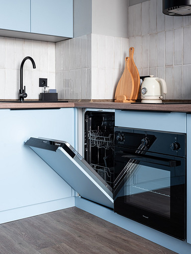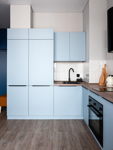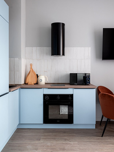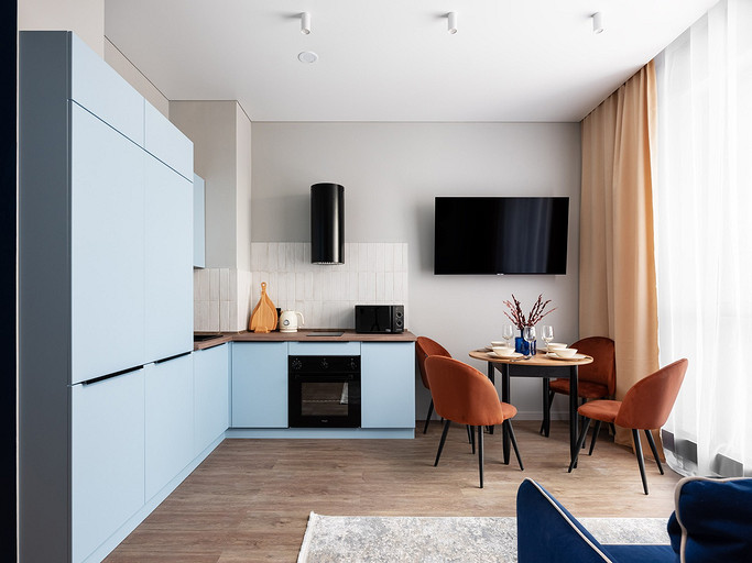 - Мебель: кухонный гарнитур сделан на заказ, диван «Первый мебельный», стулья Ridberg, журнальный столик Favorite House, стол «Столтон»