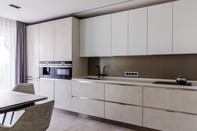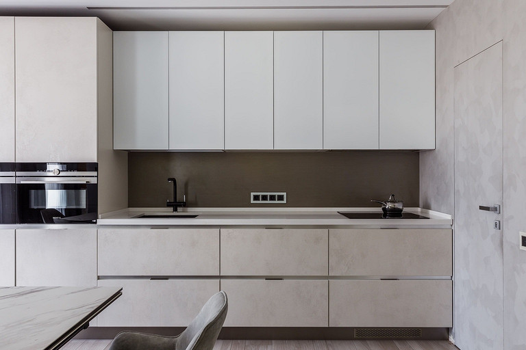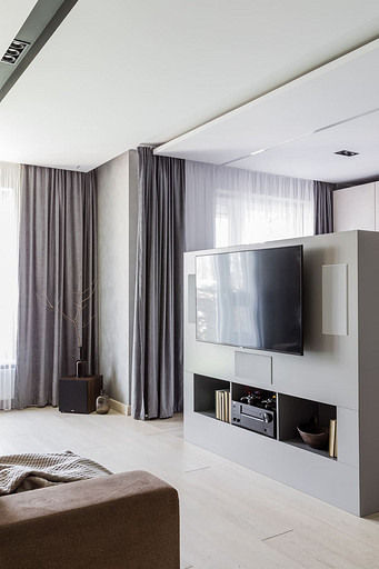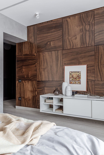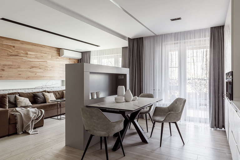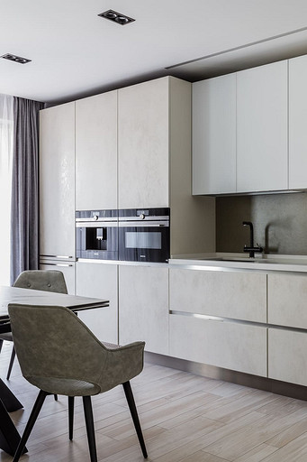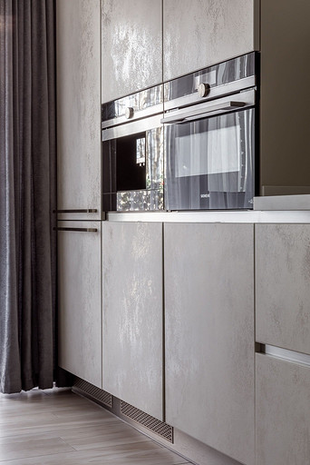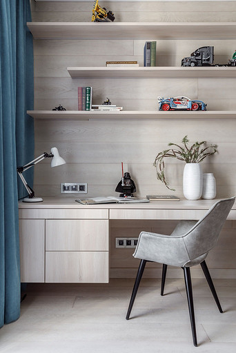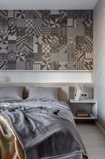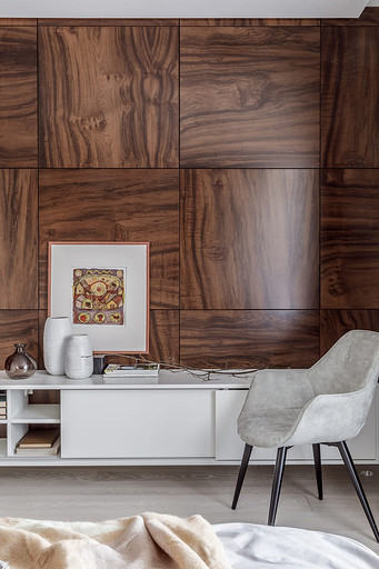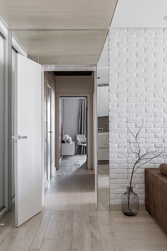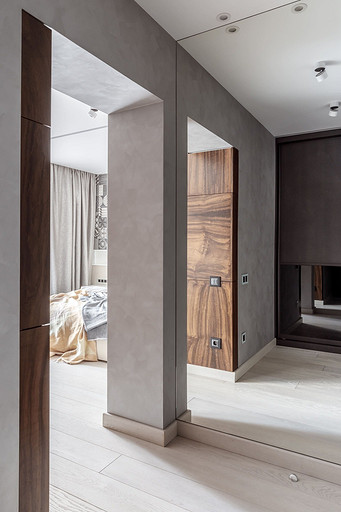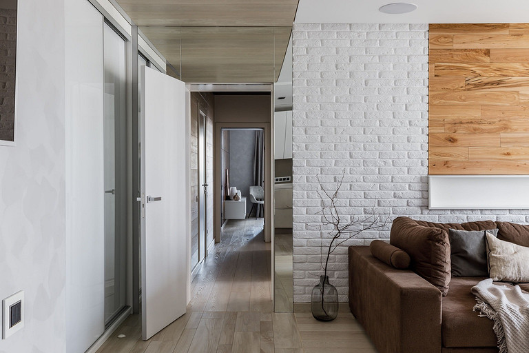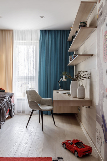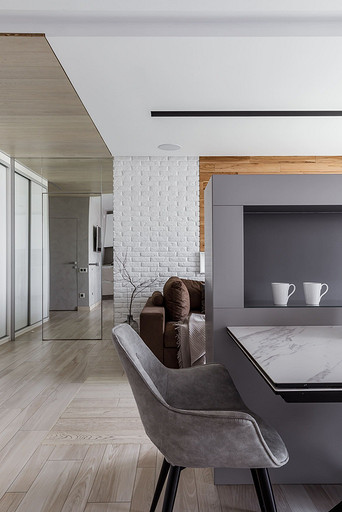 «История с продолжением» – это квартира общей площадью 120 м2, стройвариант с готовой планировкой: три спальни, гостиная, кухня, санузел и ванная. Первый этаж в этом случае — большое преимущество: окна выходят на рощу, а в распоряжении семьи есть собственная терраса. Заказчики предоставили дизайнерам полную свободу творчества, высказав одно пожелание: стиль должен быть современным. В квартире удачно разнесены общая зона (гостиная, кухня, санузел) и спальни. Однако была необходимость объединить длинные и узкие гостиную и кухню в одну большую комнату, где можно было бы и готовить, и общаться с друзьями, и отдохнуть всей семьей. Остальные три жилые комнаты по-прежнему отводились под спальни. Изначальное планировочное решение отделяло кухню-гостиную от жилого блока (спален и ванной комнаты) длинным коридором. Его мы скрыли с помощью зеркальной двери, встроенной в зеркальную поверхность стены. Таким образом была «спрятана»приватная зона и увеличено пространство кухни-гостиной. Главной проблемой перепланировки стал котел на кухне: нормы эксплуатации газового оборудования не позволяли увеличить помещение. Тогда мы просто обозначили границу двух зон стеклянной перегородкой. Все нормы были соблюдены, и новая планировка, благодаря которой помещение сильно выиграло в объеме, прошла согласование. Полноценную гардеробную молодые родители получили благодаря еще одной перепланировке. Одно подсобное помещение, при кухне, осталось в неприкосновенности, а вот хозяйственная комната рядом со спальней стала гардеробной. В итоге спальня превратилась в автономное пространство, где можно с удобством подготовиться к любому “выходу в свет”. Площадь квартиры позволила обустроить два санузла: гостевой и большую общую ванную комнату, комфортно вместившую раковину, унитаз, ванну и просторную душевую зону. Интересная черта проекта — смелое сочетание необычных цветов и материалов. Большинство людей при выборе окраски стен склоняются к привычным пастельным или светло-бежевым оттенкам — а тут графитово-серая спальня и соединение кирпича с декоративным покрытием для отделки гостиной. Привычен керамогранит на полу в прихожей и хозяйственных помещениях, как и паркетная доска в жилых комнатах. А вот керамическая плитка в качестве материала для декоративного панно в спальне стала еще одной любопытной особенностью проекта. Дерево разной текстуры и формата украсило гостиную и детские комнаты. Специально для проекта мы разработали мебель. Она существует в единственном экземпляре — как говорится, такое в магазине не купишь. А светильники нужного стиля актуальных европейских брендов, напротив, нашлись в магазине. Преобразилась и терраса. Для нее мы предложили декор, маркизу для защиты от летнего солнца и подсветку в темное время суток. P.S. А почему “История с продолжением?” К тому времени, как новая квартира приобрела законченный вид, в семье появился второй ребенок. Так что еще одна обустроенная детская пришлась весьма кстати