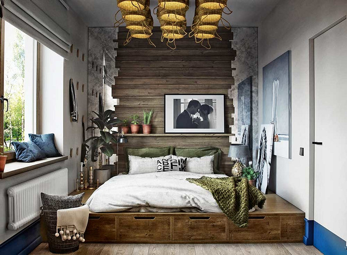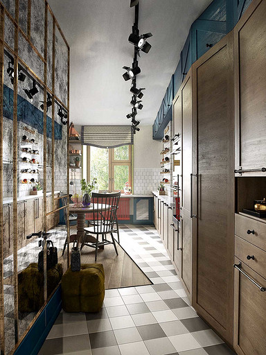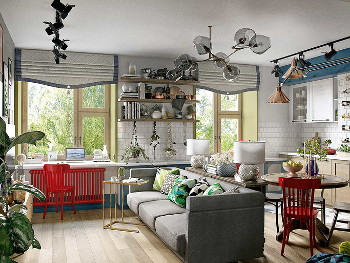 Ликвидируя перегородки между прихожей, кухней, гостиной и возводя несколько новых, дизайнеры преобразуют двушку в трёшку, в которой есть просторная многофункциональная студия, спальня и детская, ванная и хозяйственная комната. Стиль оформления — фьюжн с элементами лофта, mid-century и экоэстетики.
