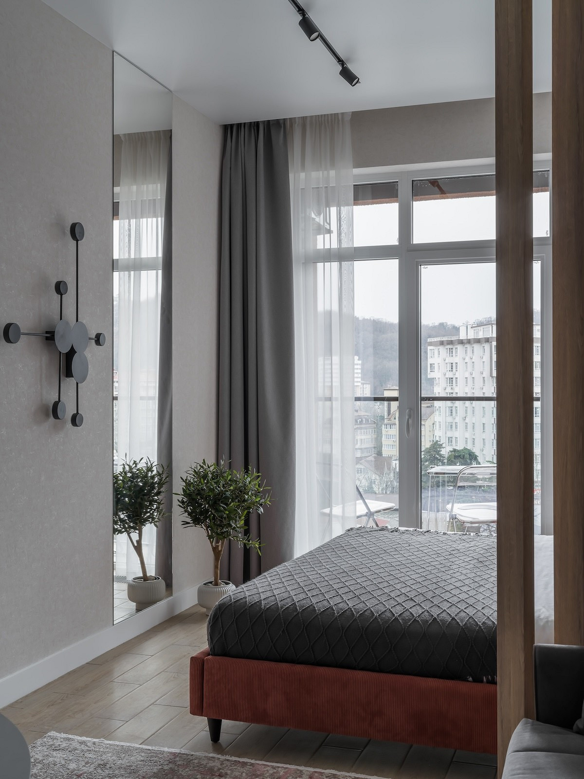 - Освещение: светильники в коридоре и трек у кровати Artelamp, подвесные светильники выполнены студией Artefact