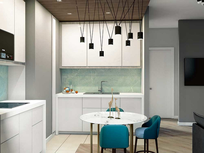 Устранив исходные ненесущие перегородки и межкомнатные проёмы и предусмотрев новые, дизайнер обустроил в двухкомнатной квартире единое пространство кухни-столовой-гостиной, а помимо него, две изолированные жилые комнаты — спальню и детскую. Для оформления была выбрана современная лаконичная эстетика.