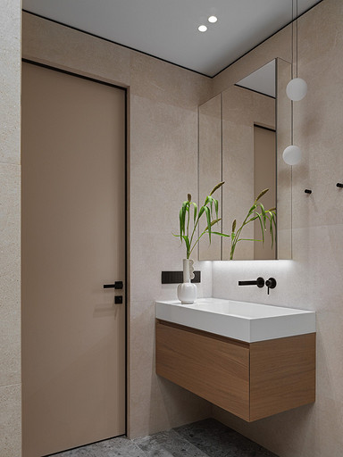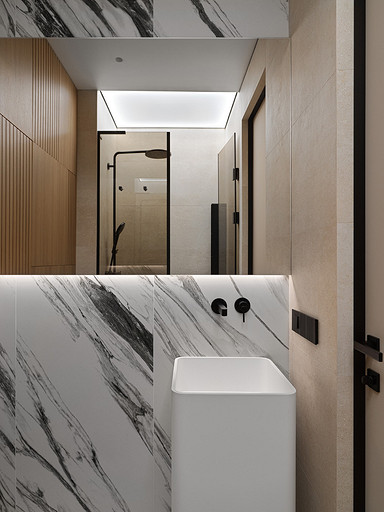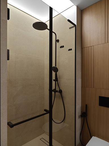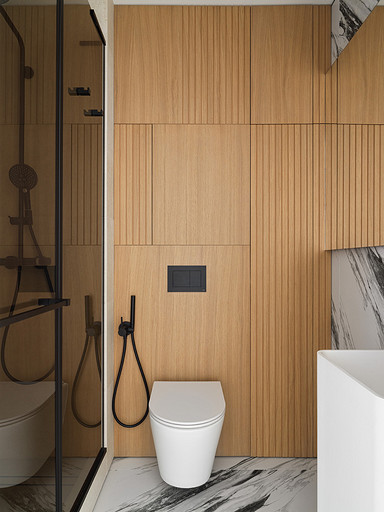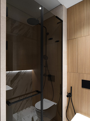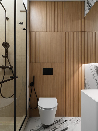 - Стены и пол: керамогранит Porcelanosa, стеновые панели МДФ