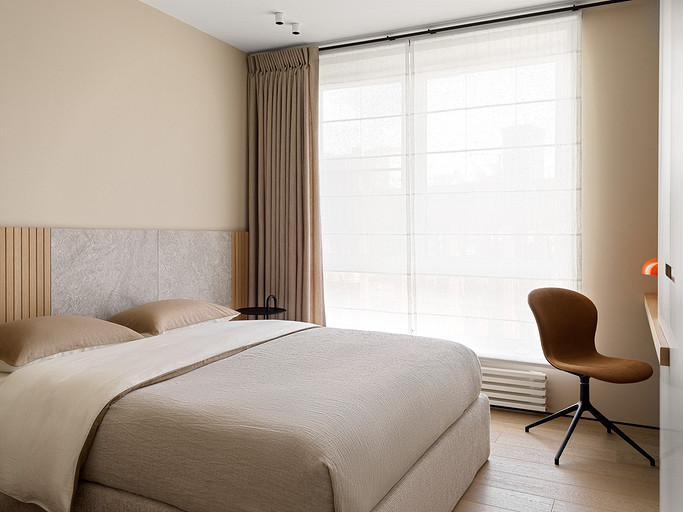 - Мебель: кровать Perrino, журнальный столик Hay, консоль Factuure, рабочий стул BoConcept