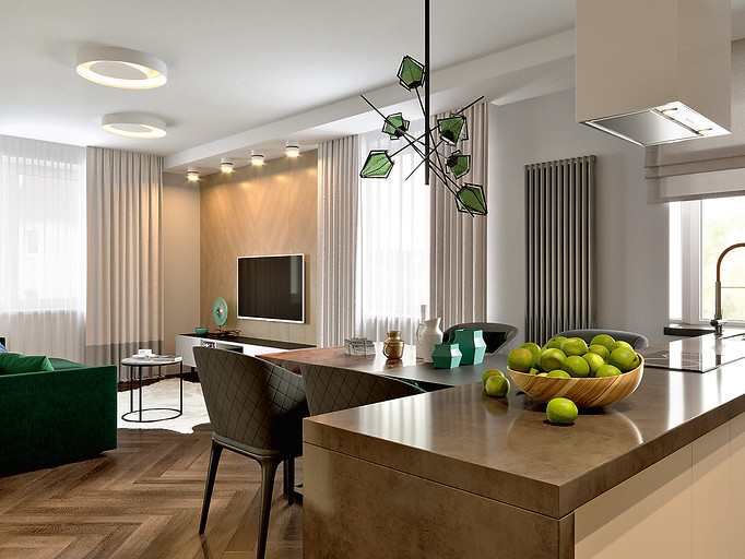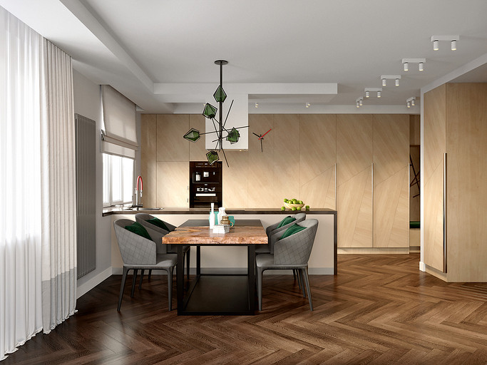 Объединив прихожую, кухню и бόльшую из комнат, архитектор-дизайнер организовал в двухкомнатной квартире просторное студийное пространство и изолированную спальню в модном стиле контемпорари.