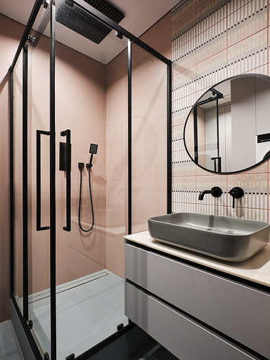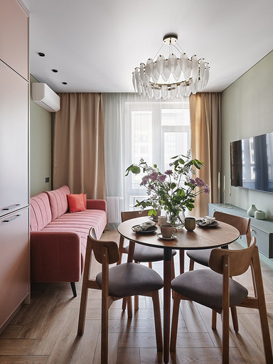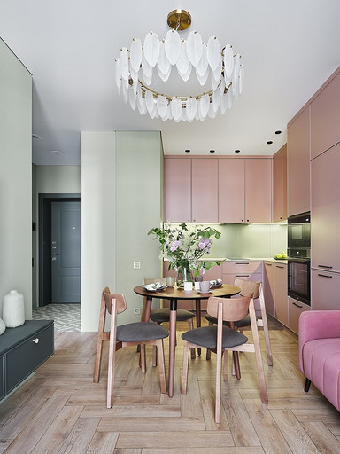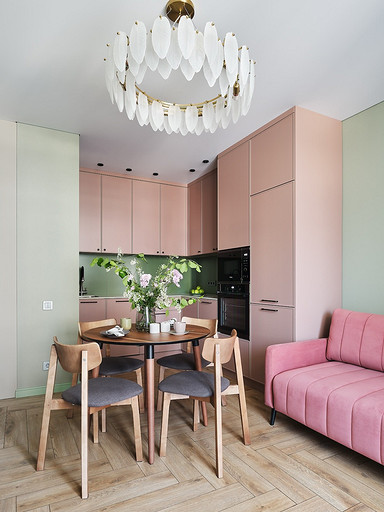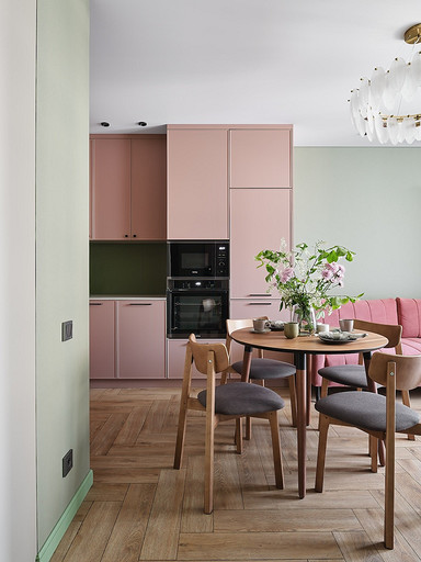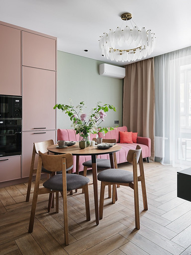 Гамма интерьера построена на сочетании зеленых оттенков, которые любят хозяева, и розовых тонов разной насыщенности. Это помогает создать свежую, в меру яркую и приятную атмосферу. Читать далее...