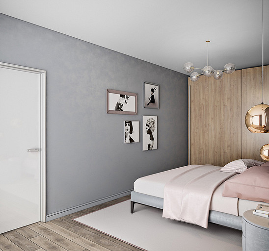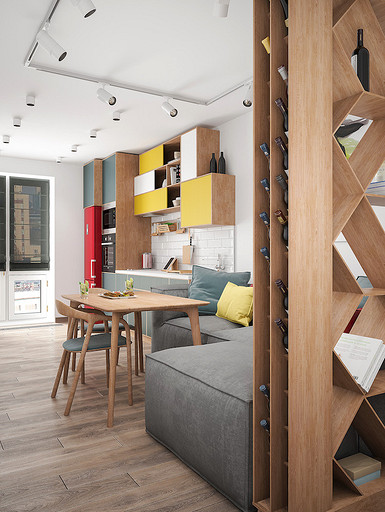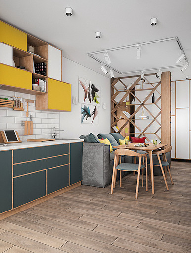 В этом проекте утилитарность обычной однушки без несущих стен была существенно повышена за счет создания кухни-столовой-гостиной и изолированной спальни.