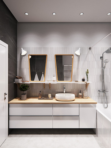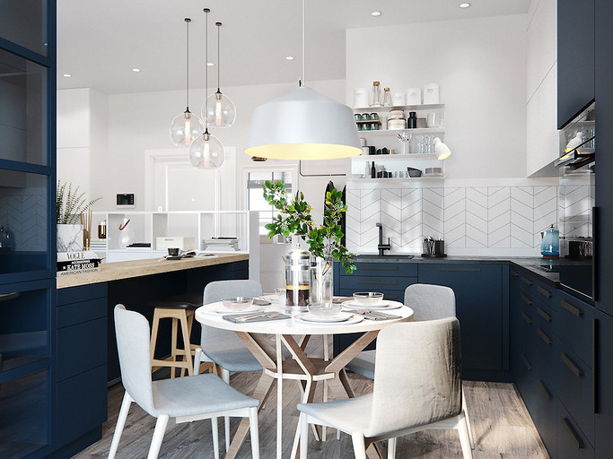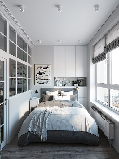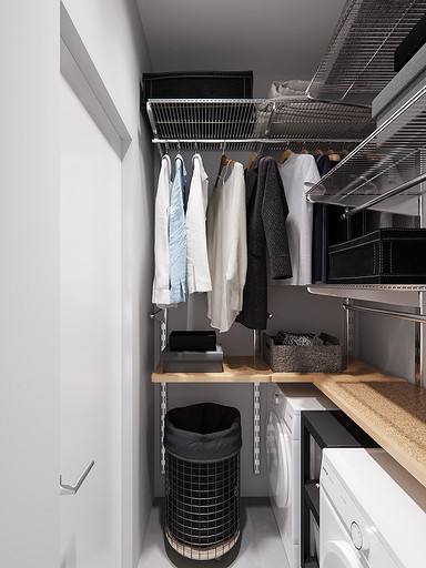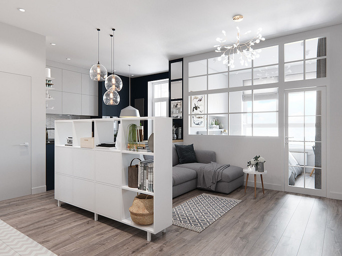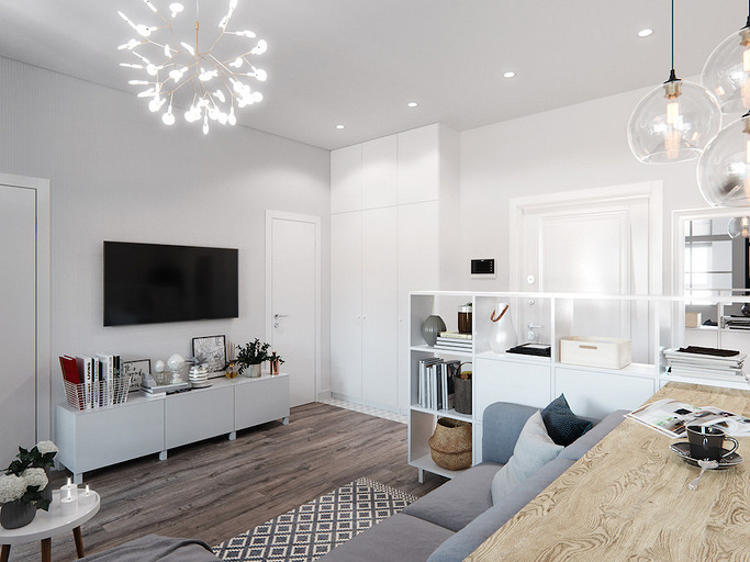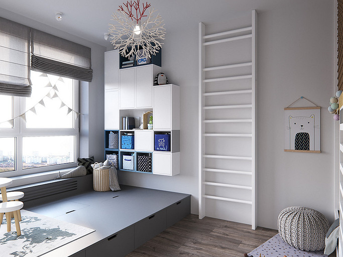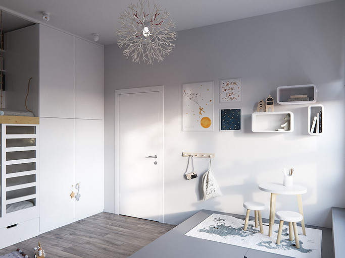 Небольшая (около 56 кв.м.) площадь квартиры в ЖК «Ривер Парк» не помешала дизайнеру создать минималистичное пространство с белоснежной отделкой и темными акцентами, продуманными системами хранения и подкупающими, вроде чердака для игр, решениями в детской.